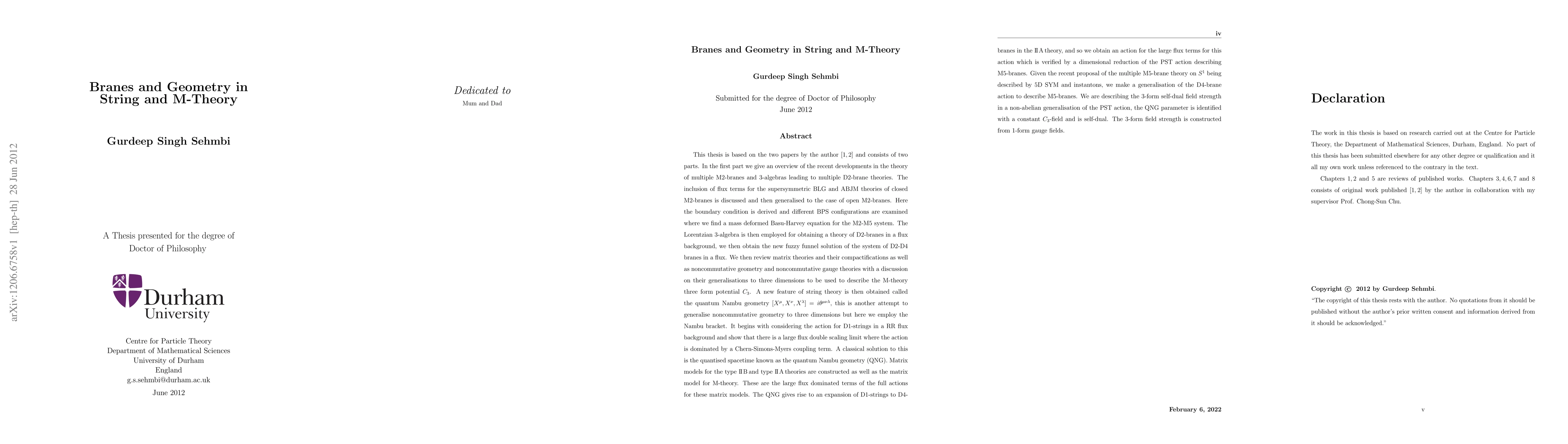 This thesis is based on two papers by the author and consists of two parts. We review the recent developments in the theory of multiple M2-branes and 3-algebras leading to multiple D2-brane theories. The inclusion of flux terms for the supersymmetric BLG and ABJM theories of closed M2-branes is discussed and then generalised to open M2-branes. Here the boundary condition is derived and different BPS configurations are examined where we find a mass deformed Basu-Harvey equation for the M2-M5 system. The Lorentzian 3-algebra is then employed for obtaining a theory of D2-branes in a flux background, we then obtain the new fuzzy funnel solution of the system of D2-D4 branes in a flux. Matrix theories and their compactifications as well as noncommutative geometry and noncommutative gauge theories are reviewed with a discussion of their generalisations to three dimensions to be used to describe the M-theory three form potential $C_3$. A new feature of string theory is then obtained called the quantum Nambu geometry (QNG). It is found by considering the action for D1-strings in a RR flux background and we demonstrate that there is a large flux double scaling limit where the action is dominated by a Chern-Simons-Myers coupling term. A classical solution to this is the quantised spacetime known as the quantum Nambu geometry. Various matrix models are obtained from this action, these are the large flux dominated terms of the full actions for the corresponding matrix models. The QNG gives rise to an expansion of D1-strings to D4-branes in the IIA theory, so we obtain an action for the large flux terms for this action which is verified by a dimensional reduction of the PST action describing M5-branes. We make a generalisation of the D4-brane action to describe M5-branes using a duality. We are describing the 3-form self-dual field strength of a non-abelian generalisation of the PST action.