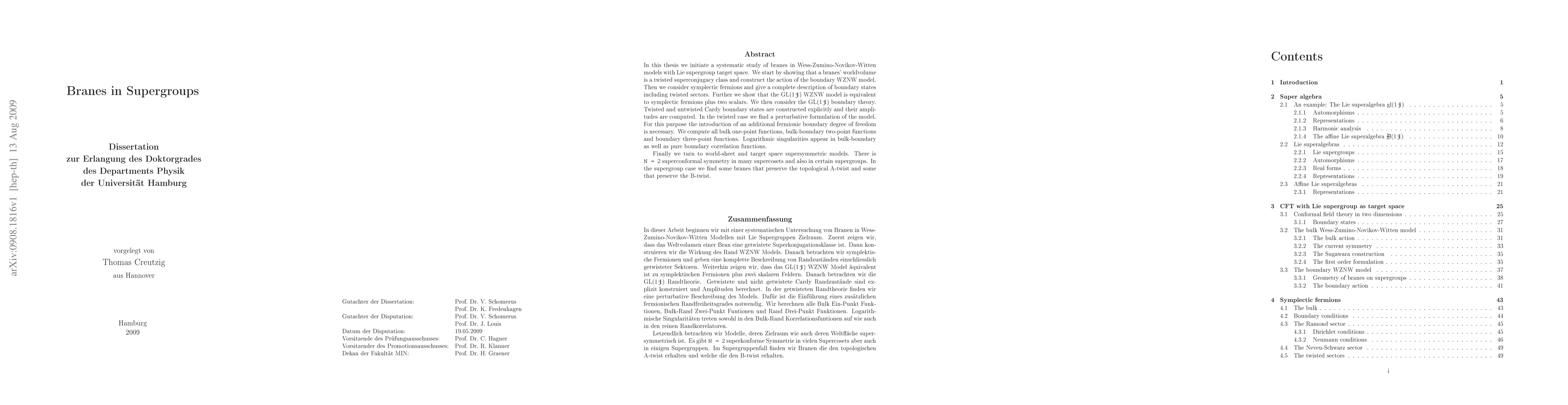 In this thesis we initiate a systematic study of branes in Wess-Zumino-Novikov-Witten models with Lie supergroup target space. We start by showing that a branes' worldvolume is a twisted superconjugacy class and construct the action of the boundary WZNW model. Then we consider symplectic fermions and give a complete description of boundary states including twisted sectors. Further we show that the GL(1|1) WZNW model is equivalent to symplectic fermions plus two scalars. We then consider the GL(1|1) boundary theory. Twisted and untwisted Cardy boundary states are constructed explicitly and their amplitudes are computed. In the twisted case we find a perturbative formulation of the model. For this purpose the introduction of an additional fermionic boundary degree of freedom is necessary. We compute all bulk one-point functions, bulk-boundary two-point functions and boundary three-point functions. Logarithmic singularities appear in bulk-boundary as well as pure boundary correlation functions. Finally we turn to world-sheet and target space supersymmetric models. There is N=2 superconformal symmetry in many supercosets and also in certain supergroups. In the supergroup case we find some branes that preserve the topological A-twist and some that preserve the B-twist.