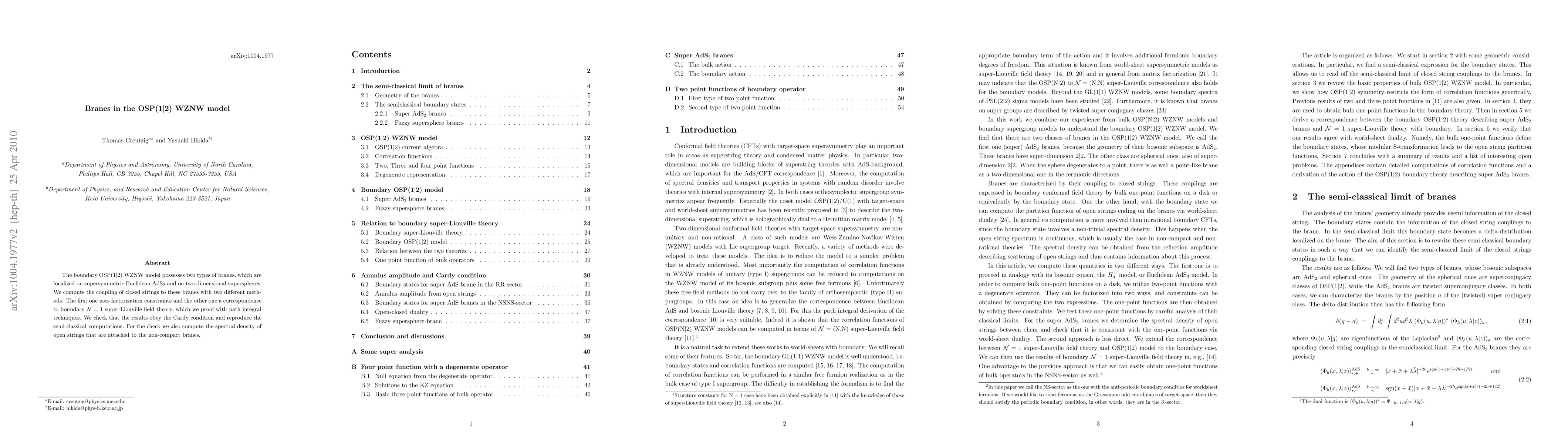 The paper investigates branes in the OSP(1|2) Wess-Zumino-Novikov-Witten (WZNW) model, identifying two types localized on supersymmetric Euclidean AdS$_2$ and two-dimensional superspheres. It employs factorization constraints and a correspondence to boundary N=1 super-Liouville field theory to compute the closed string coupling to these branes, confirming results via the Cardy condition and spectral density computations of open strings attached to non-compact branes.