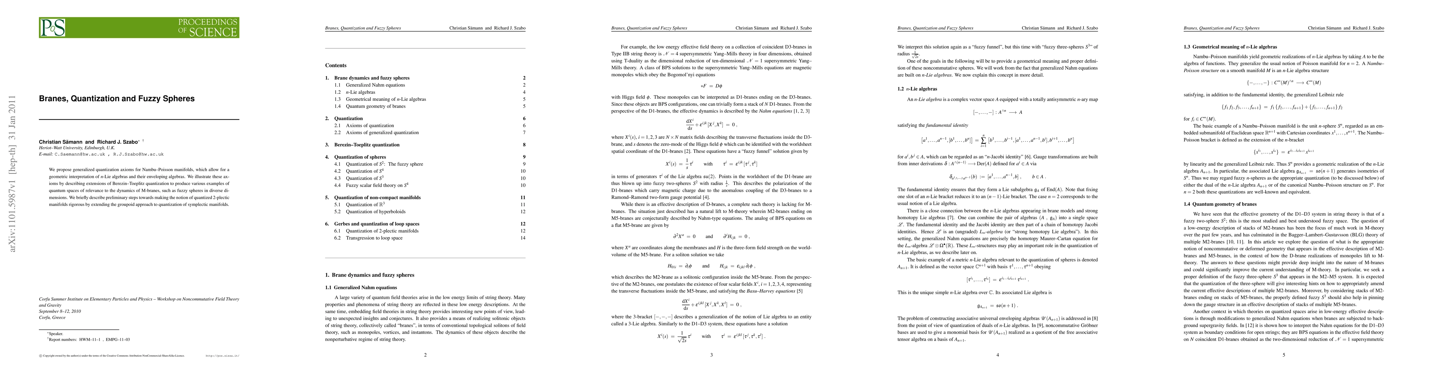 We propose generalized quantization axioms for Nambu-Poisson manifolds, which allow for a geometric interpretation of n-Lie algebras and their enveloping algebras. We illustrate these axioms by describing extensions of Berezin-Toeplitz quantization to produce various examples of quantum spaces of relevance to the dynamics of M-branes, such as fuzzy spheres in diverse dimensions. We briefly describe preliminary steps towards making the notion of quantized 2-plectic manifolds rigorous by extending the groupoid approach to quantization of symplectic manifolds.