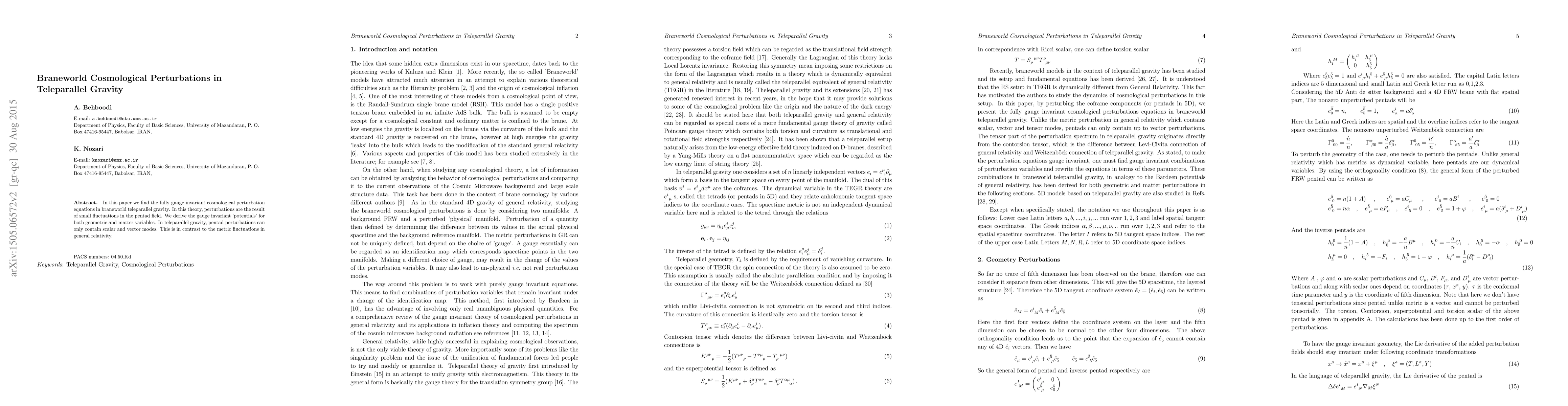 This paper derives fully gauge invariant perturbation equations for braneworld cosmology in teleparallel gravity, focusing on scalar and vector modes from pentad field fluctuations, while noting that tensor modes arise from the contortion tensor instead of metric fluctuations as in general relativity.