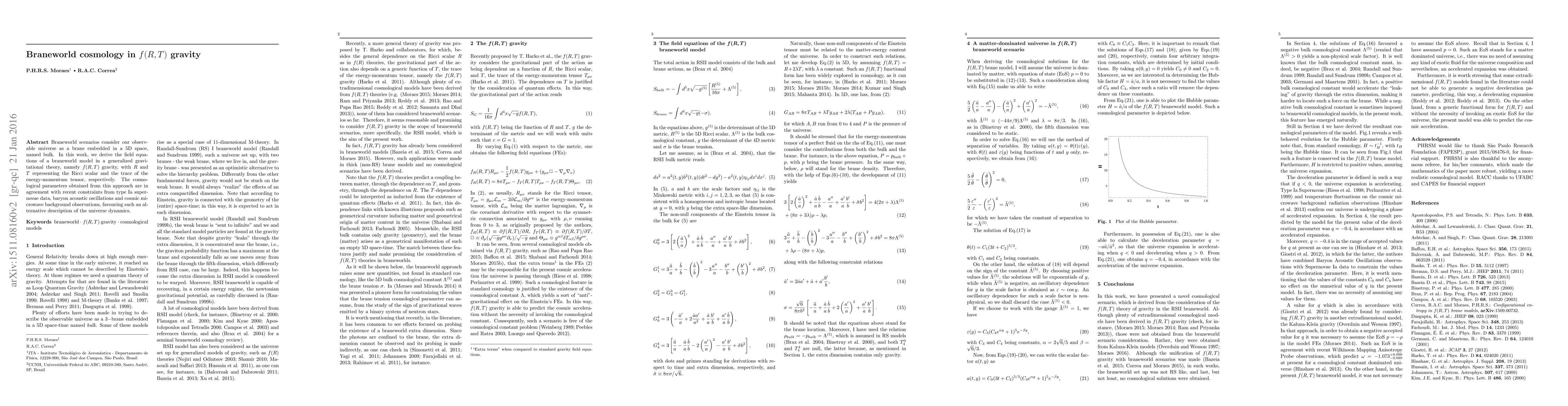 This paper derives the field equations for a braneworld cosmology within the framework of $f(R,T)$ gravity, where $R$ and $T$ represent the Ricci scalar and the trace of the energy-momentum tensor, respectively. The derived cosmological parameters align with observational data, supporting this alternative model of universe dynamics.