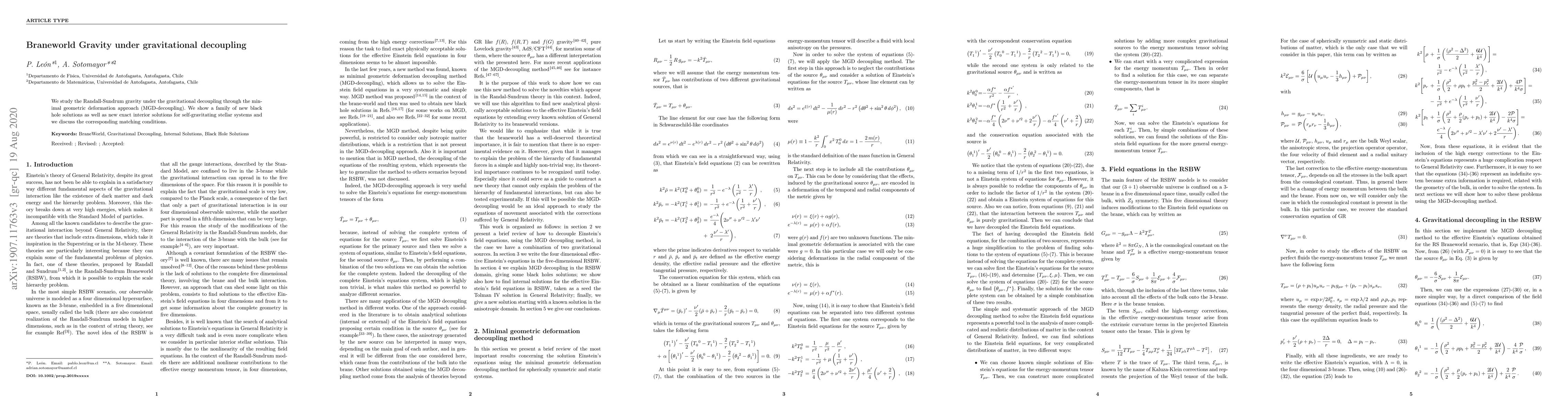 The main objective of this work is to study in some detail the Randall-Sundrum gravity under the gravitational decoupling through the minimal geometric deformation approach (MGD-decoupling). We show a family of new black hole solutions as well as new exact interior solutions for self-gravitating stellar systems and we discuss the corresponding matching conditions.