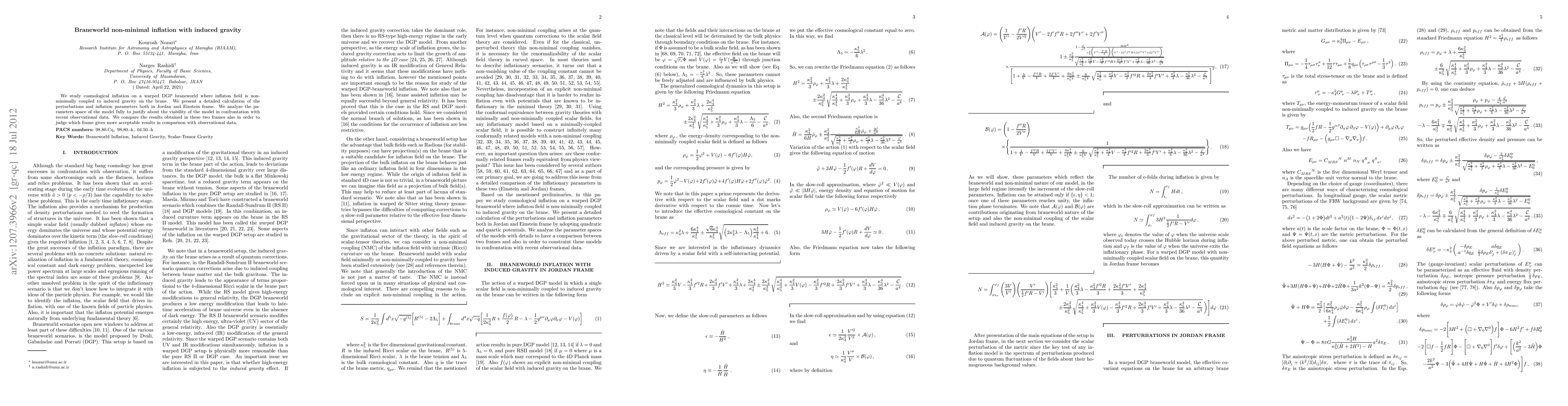 We study cosmological inflation on a warped DGP braneworld where inflaton field is non-minimally coupled to induced gravity on the brane. We present a detailed calculation of the perturbations and inflation parameters both in Jordan and Einstein frame. We analyze the parameters space of the model fully to justify about the viability of the model in confrontation with recent observational data. We compare the results obtained in these two frames also in order to judge which frame gives more acceptable results in comparison with observational data.