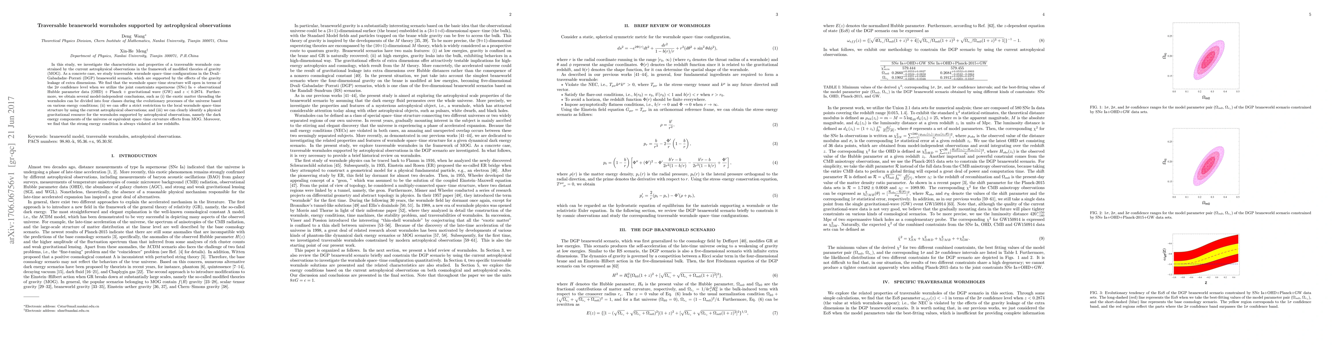 In this study, we investigate the characteristics and properties of a traversable wormhole constrained by the current astrophysical observations in the framework of modified theories of gravity (MOG). As a concrete case, we study traversable wormhole space--time configurations in the Dvali--Gabadadze--Porrati (DGP) braneworld scenario, which are supported by the effects of the gravity leakage of extra dimensions. We find that the wormhole space--time structure will open in terms of the $2\sigma$ confidence level when we utilize the joint constraints supernovae (SNe) Ia + observational Hubble parameter data (OHD) + Planck + gravitational wave (GW) and $z<0.2874$. Furthermore, we obtain several model-independent conclusions, such as (i) the exotic matter threading the wormholes can be divided into four classes during the evolutionary processes of the universe based on various energy conditions; (ii) we can offer a strict restriction to the local wormhole space--time structure by using the current astrophysical observations; and (iii) we can clearly identify a physical gravitational resource for the wormholes supported by astrophysical observations, namely the dark energy components of the universe or equivalent space--time curvature effects from MOG. Moreover, we find that the strong energy condition is always violated at low redshifts.