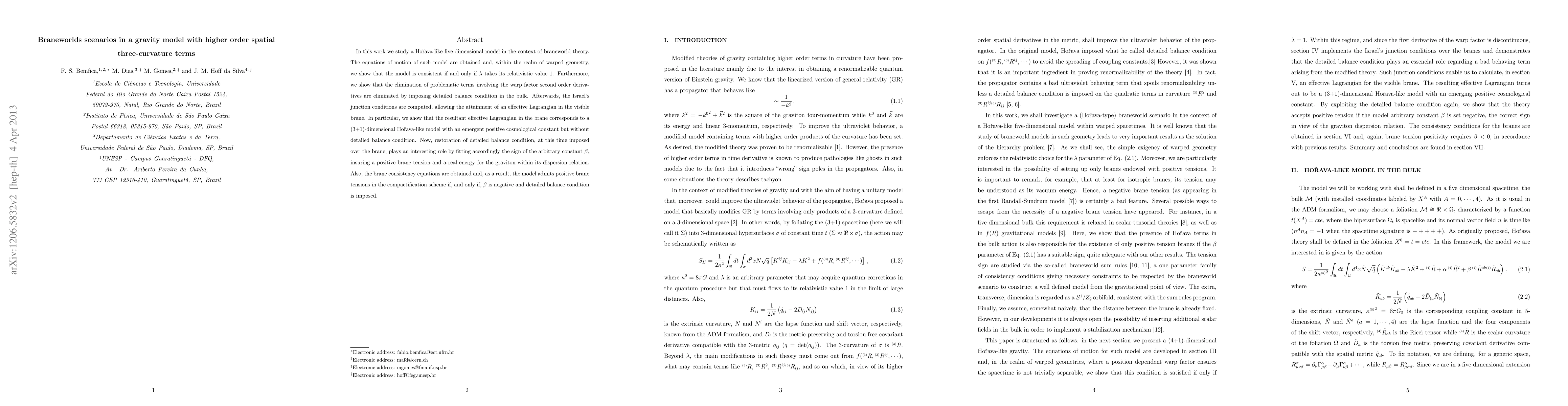 In this work we study a Horava-like five-dimensional model in the context of braneworld theory. To begin with, the equations of motion of such model are obtained and, within the realm of warped geometry, we show that the model is consistent if and only if $\lambda$ takes its relativistic value 1. Furthermore, since the first derivative of the warp factor is discontinuous over the branes, we show that the elimination of problematic terms involving the square of the warp factor second order derivatives are eliminated by imposing detailed balance condition in the bulk. Afterwards, the Israel's junction conditions are computed, allowing the attainment of an effective Lagrangian in the visible brane. In particular, for a (4+1)-dimensional Horava-like model defined in the bulk without cosmological constant, we show that the resultant effective Lagrangian in the brane corresponds to a (3+1)-dimensional Horava-like model with an emergent positive cosmological constant but without detailed balance condition. Now, restoration of detailed balance condition, at this time imposed over the brane, plays an interesting role by fitting accordingly the sign of the arbitrary constant $\beta$ that labels the extra terms in the model, insuring a positive brane tension and a real energy for the graviton within its dispersion relation. To end up with, the brane consistency equations are obtained and, as a result, we show that the detailed balance condition again plays an essential role in eliminating bad behaving terms and that the model admits positive brane tensions in the compactification scheme if, and only if, $\beta$ is negative, what is in accordance with the previous result obtained for the visible brane.