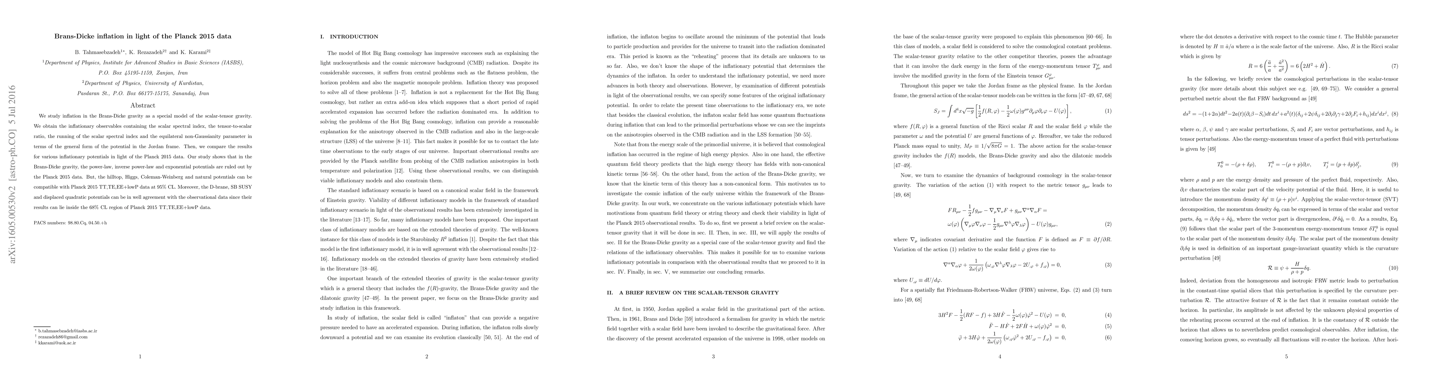 This paper investigates Brans-Dicke gravity as a model for inflation, deriving key inflationary observables and comparing them against the Planck 2015 data. It finds that while power-law, inverse power-law, and exponential potentials are ruled out, several other potentials, including hilltop, Higgs, Coleman-Weinberg, and natural, remain compatible with the data at 95% confidence level.