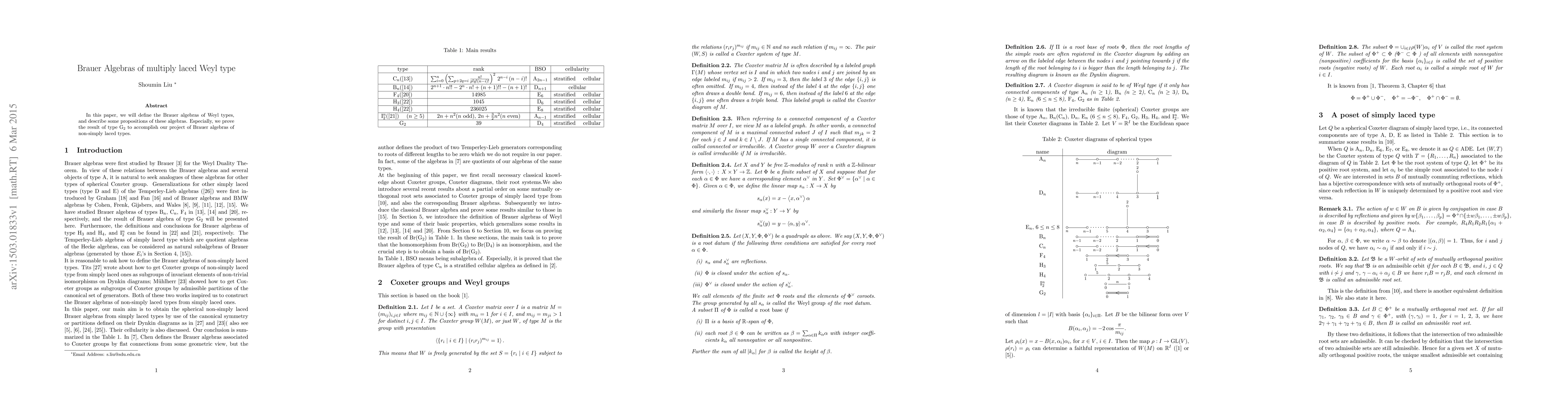 This paper introduces Brauer algebras of Weyl types and provides propositions about them, focusing on proving results for the $G_2$ type to complete the study of non-simply laced types.