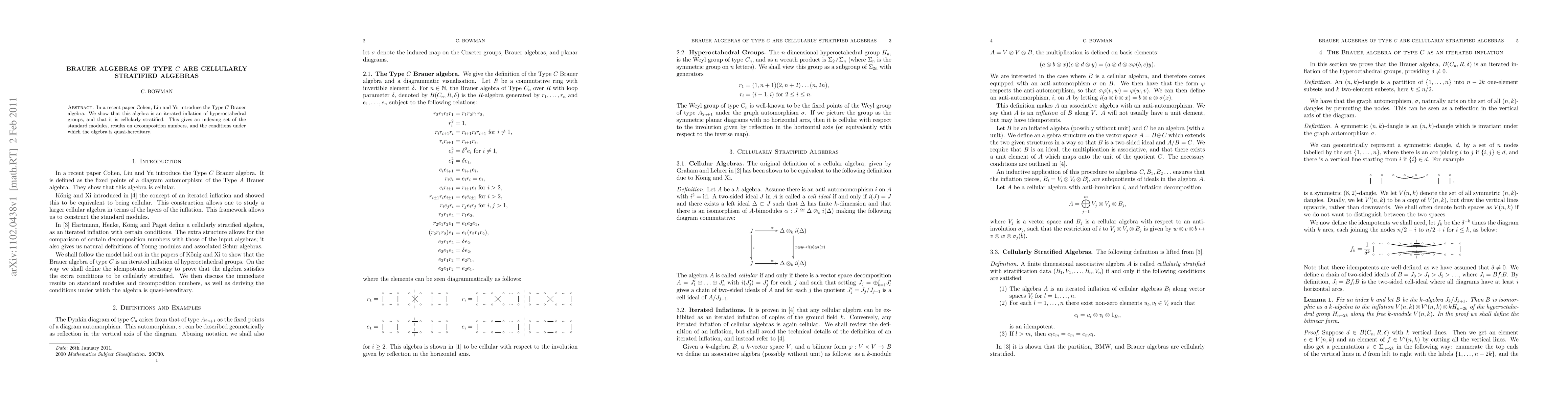 In a recent paper Cohen, Liu and Yu introduce the Type $C$ Brauer algebra. We show that this algebra is an iterated inflation of hyperoctahedral groups, and that it is cellularly stratified. This gives an indexing set of the standard modules, results on decomposition numbers, and the conditions under which the algebra is quasi-hereditary.