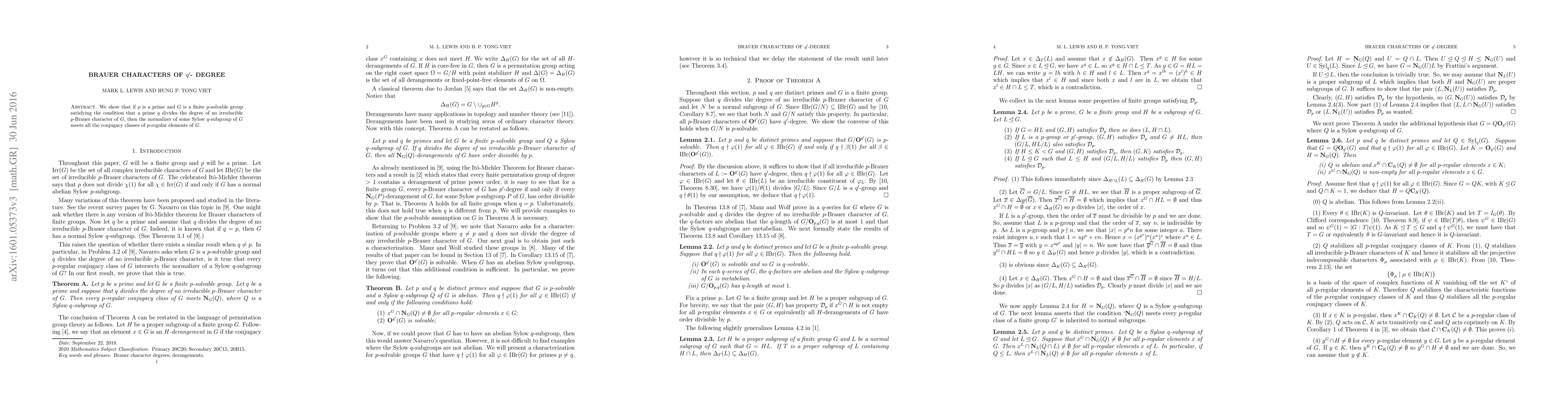 We show that if $p$ is a prime and $G$ is a finite $p$-solvable group satisfying the condition that a prime $q$ divides the degree of no irreducible $p$-Brauer character of $G$, then the normalizer of some Sylow $q$-subgroup of $G$ meets all the conjugacy classes of $p$-regular elements of $G$.