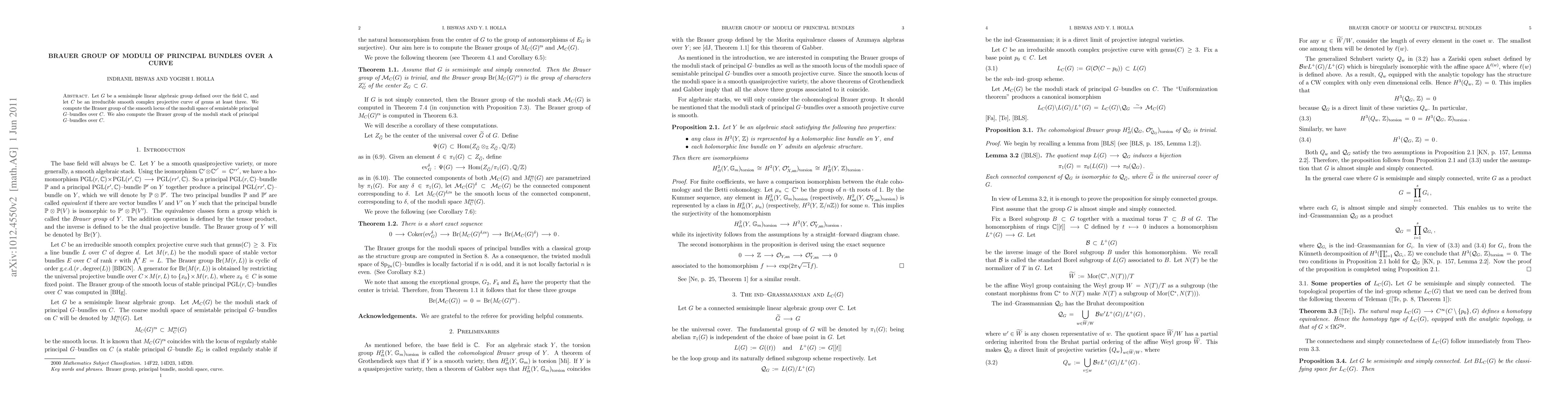 This paper computes the Brauer group of the moduli space of semistable principal $G$-bundles and the moduli stack of principal $G$-bundles over a complex projective curve $C$ of genus at least three, where $G$ is a semisimple linear algebraic group over $\mathbb{C}$.