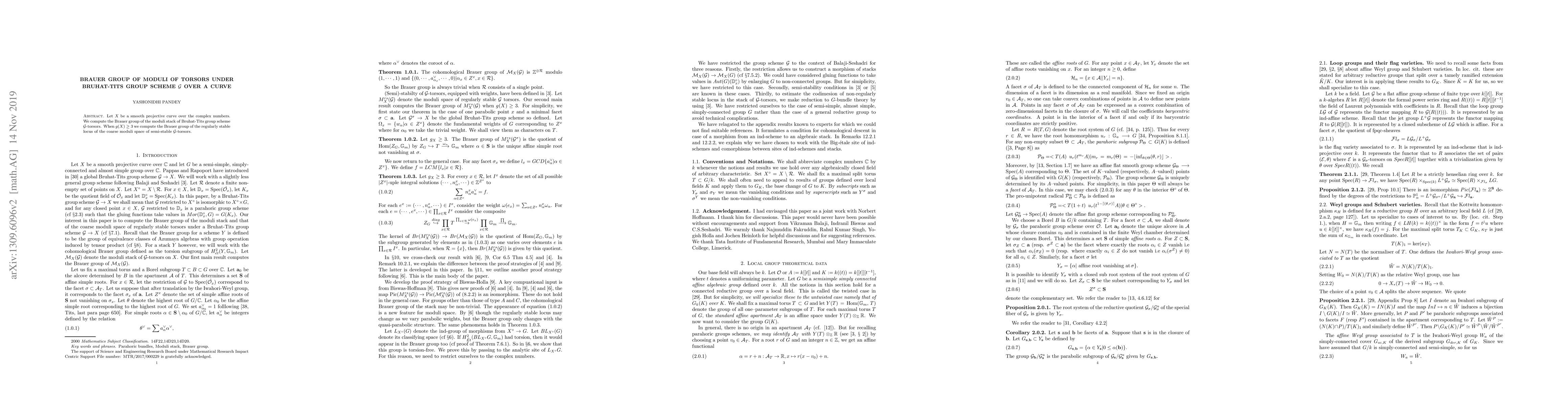 Let $X$ be a smooth projective curve over the complex numbers. We compute the Brauer group of the moduli stack of Bruhat-Tits group scheme $\mathcal{G}$-torsors on $X$. When $g(X) \geq 3$ we compute the Brauer group of the regularly stable locus of the coarse moduli space of semi-stable $\mathcal{G}$-torsors.