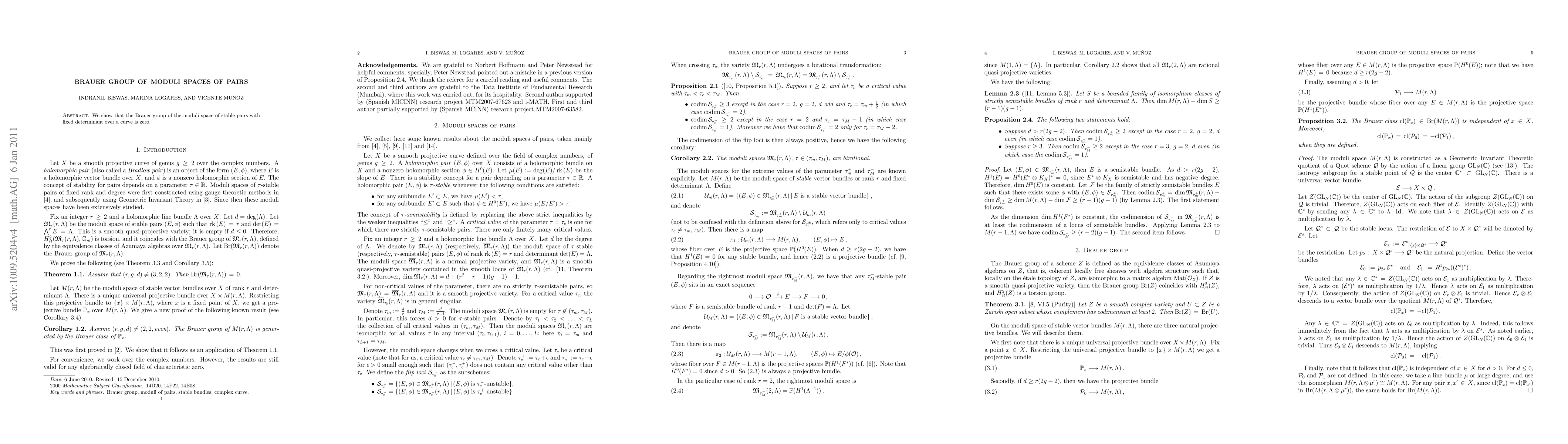 We show that the Brauer group of any moduli space of stable pairs with fixed determinant over a curve is zero.