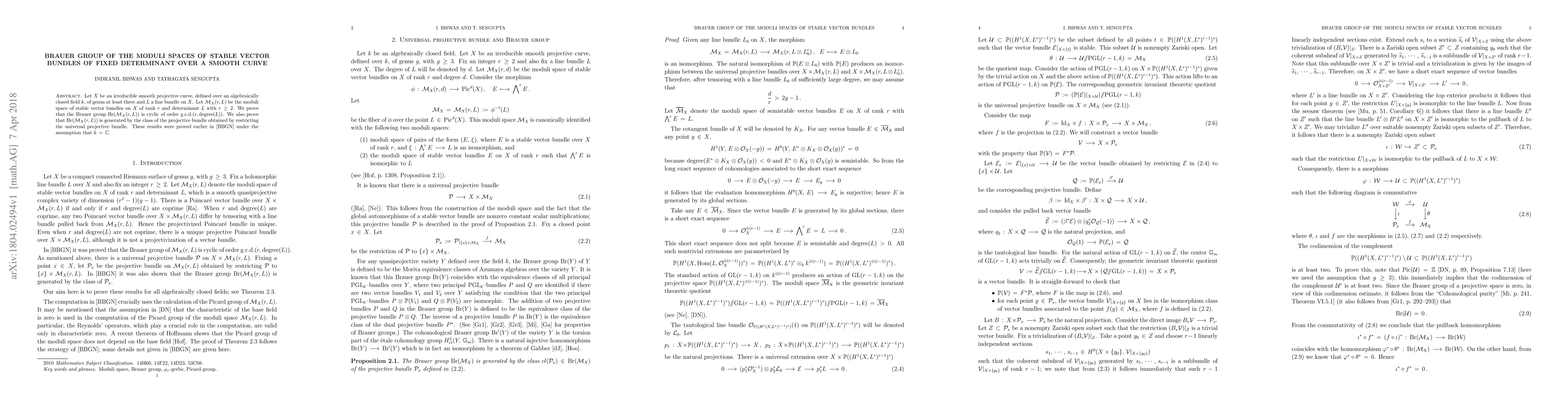 Let $X$ be an irreducible smooth projective curve, defined over an algebraically closed field $k$, of genus at least three and $L$ a line bundle on $X$. Let ${\mathcal M}_X(r,L)$ be the moduli space of stable vector bundles on $X$ of rank $r$ and determinant $L$ with $r\geq 2$. We prove that the Brauer group ${\rm Br}(\mathcal{M}_X(r,L))$ is cyclic of order ${\rm g.c.d.}(r,{\rm degree}(L))$. We also prove that ${\rm Br}(\mathcal{M}_X(r,L))$ is generated by the class of the projective bundle obtained by restricting the universal projective bundle. These results were proved earlier in \cite{BBGN} under the assumption that $k=\mathbb C$.