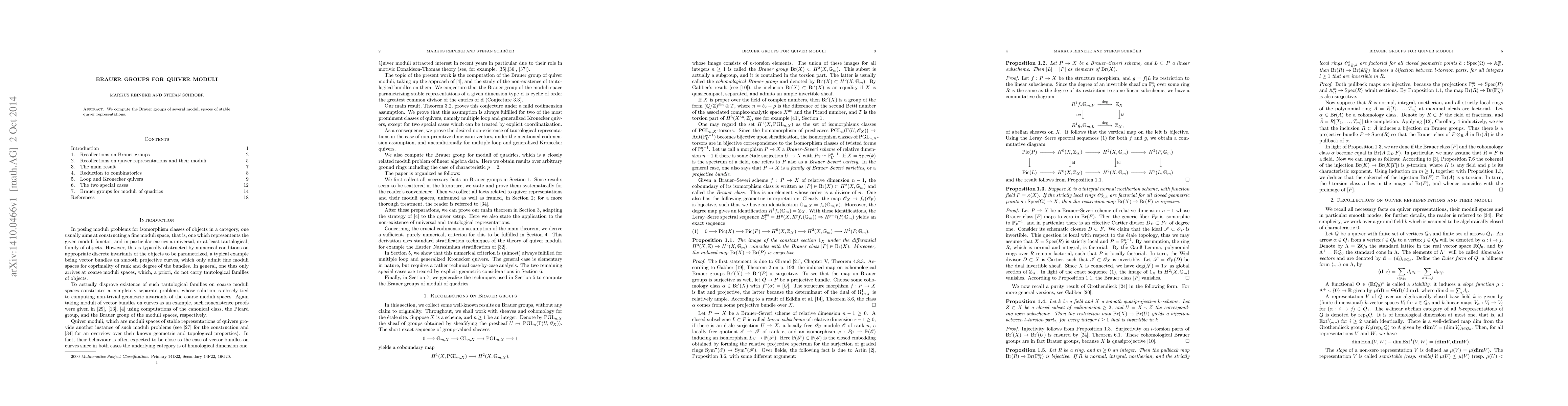 Summary: This paper computes the Brauer groups for various moduli spaces derived from stable quiver representations, providing insights into their algebraic structures. The findings enhance the understanding of the connections between representation theory and algebraic geometry.