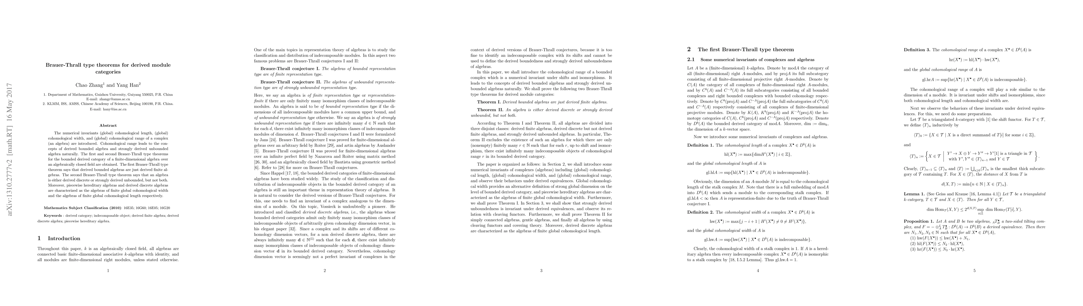 The numerical invariants (global) cohomological length, (global) cohomological width, and (global) cohomological range of complexes (algebras) are introduced. Cohomological range leads to the concepts of derived bounded algebras and strongly derived unbounded algebras naturally. The first and second Brauer-Thrall type theorems for the bounded derived category of a finite-dimensional algebra over an algebraically closed field are obtained. The first Brauer-Thrall type theorem says that derived bounded algebras are just derived finite algebras. The second Brauer-Thrall type theorem says that an algebra is either derived discrete or strongly derived unbounded, but not both. Moreover, piecewise hereditary algebras and derived discrete algebras are characterized as the algebras of finite global cohomological width and finite global cohomological length respectively.