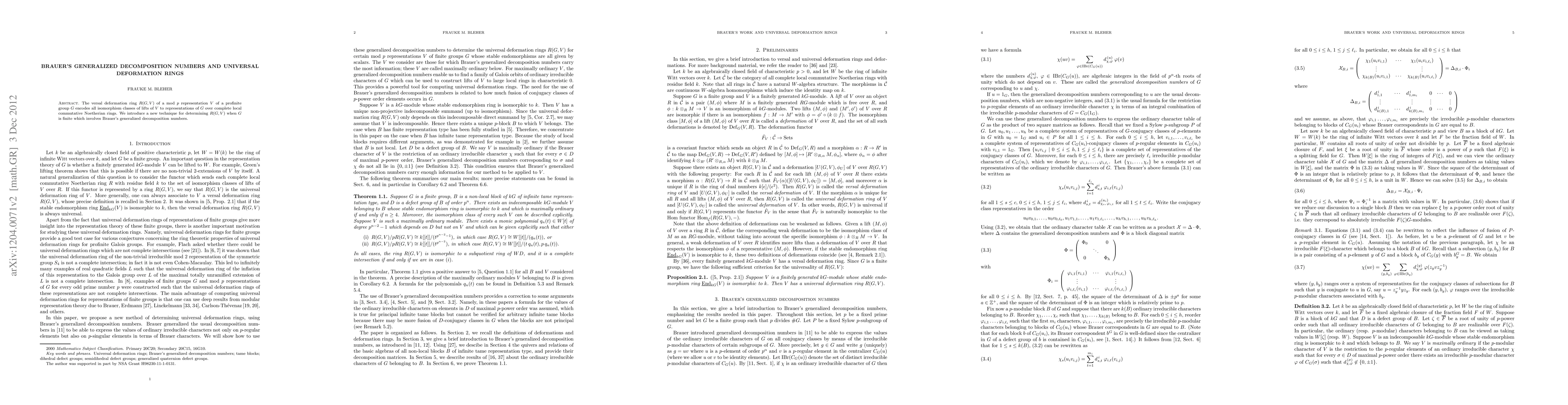 Summary: This paper introduces a novel method to determine the versal deformation ring R(G,V) for finite groups G using Brauer's generalized decomposition numbers, providing a new approach to lifting mod p representations to complete local commutative Noetherian rings.