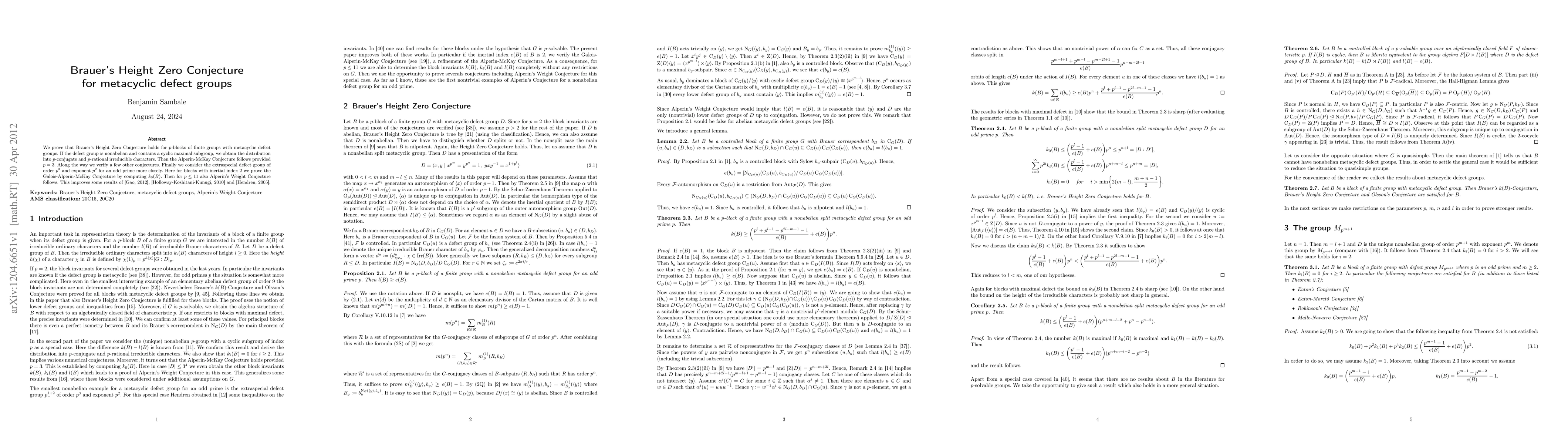 The paper introduces and utilizes a detailed analysis of the structure of p-blocks with metacyclic defect groups, leading to new insights and proofs regarding Brauer's Height Zero Conjecture and related conjectures.