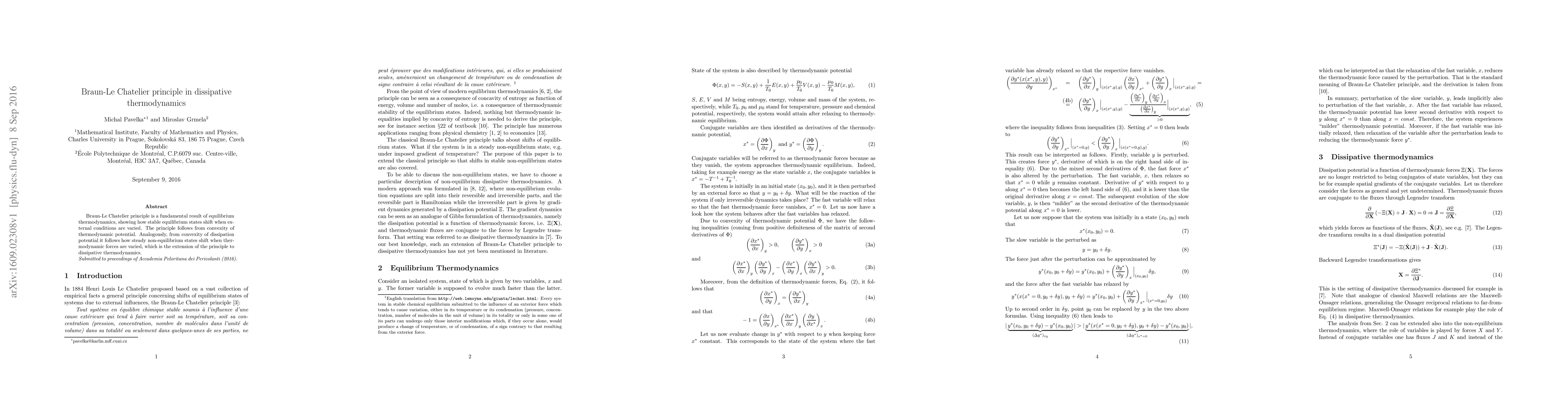 The Braun-Le Chatelier principle explains shifts in equilibrium states due to external condition changes, derived from thermodynamic potential convexity. Its extension to dissipative thermodynamics reveals how steady non-equilibrium states adjust under varying thermodynamic forces, based on the convexity of dissipation potential.