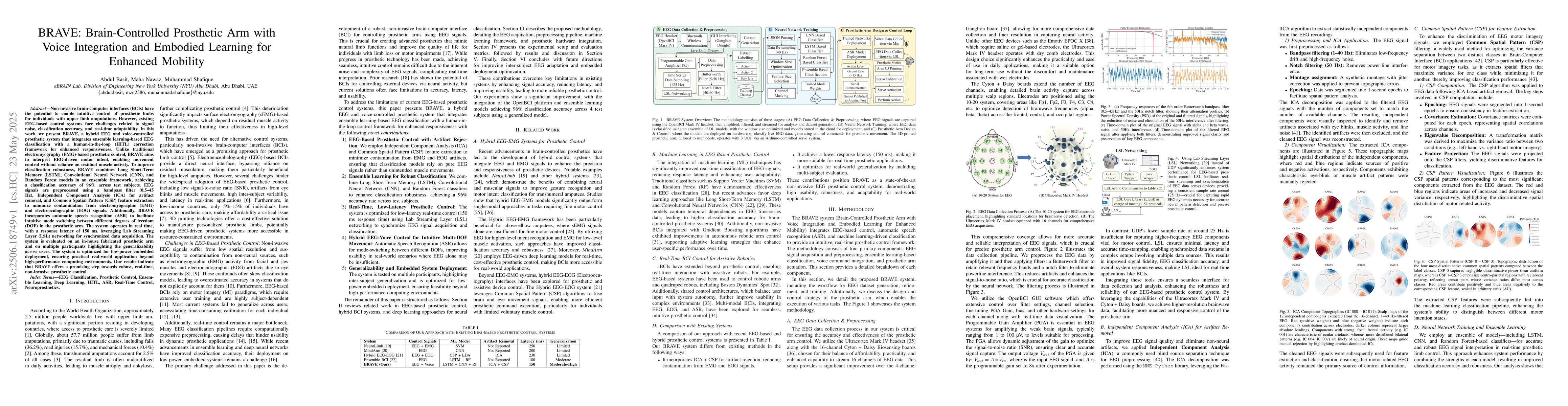 Non-invasive brain-computer interfaces (BCIs) have the potential to enable intuitive control of prosthetic limbs for individuals with upper limb amputations. However, existing EEG-based control systems face challenges related to signal noise, classification accuracy, and real-time adaptability. In this work, we present BRAVE, a hybrid EEG and voice-controlled prosthetic system that integrates ensemble learning-based EEG classification with a human-in-the-loop (HITL) correction framework for enhanced responsiveness. Unlike traditional electromyography (EMG)-based prosthetic control, BRAVE aims to interpret EEG-driven motor intent, enabling movement control without reliance on residual muscle activity. To improve classification robustness, BRAVE combines LSTM, CNN, and Random Forest models in an ensemble framework, achieving a classification accuracy of 96% across test subjects. EEG signals are preprocessed using a bandpass filter (0.5-45 Hz), Independent Component Analysis (ICA) for artifact removal, and Common Spatial Pattern (CSP) feature extraction to minimize contamination from electromyographic (EMG) and electrooculographic (EOG) signals. Additionally, BRAVE incorporates automatic speech recognition (ASR) to facilitate intuitive mode switching between different degrees of freedom (DOF) in the prosthetic arm. The system operates in real time, with a response latency of 150 ms, leveraging Lab Streaming Layer (LSL) networking for synchronized data acquisition. The system is evaluated on an in-house fabricated prosthetic arm and on multiple participants highlighting the generalizability across users. The system is optimized for low-power embedded deployment, ensuring practical real-world application beyond high-performance computing environments. Our results indicate that BRAVE offers a promising step towards robust, real-time, non-invasive prosthetic control.