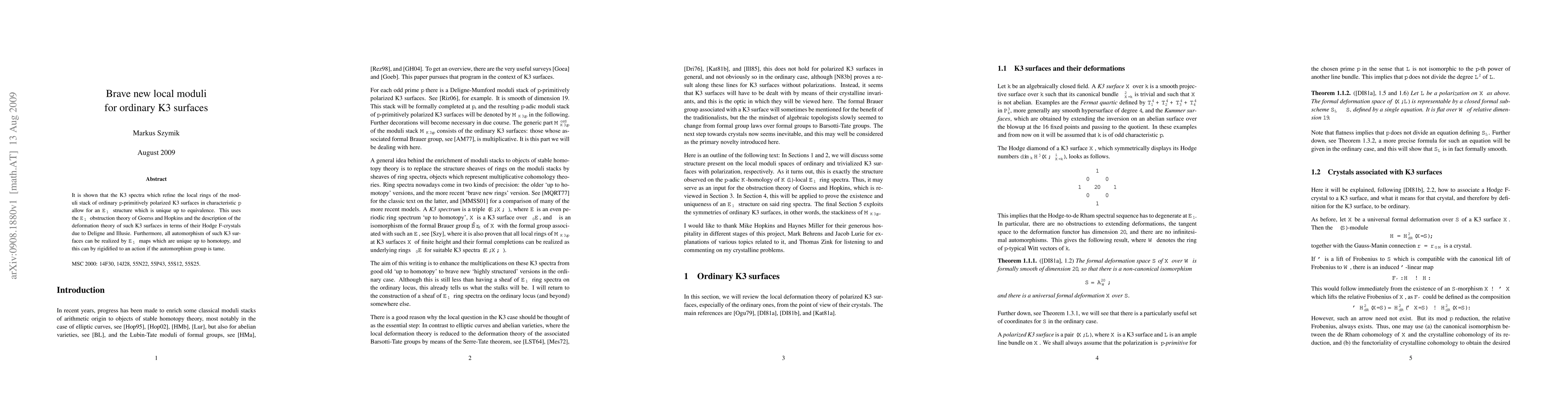 This paper demonstrates that K3 spectra refining local rings of the moduli stack for ordinary p-primitively polarized K3 surfaces possess a unique Eoo structure. It leverages Goerss and Hopkins' Eoo obstruction theory and Deligne-Illusie's deformation theory via Hodge F-crystals.