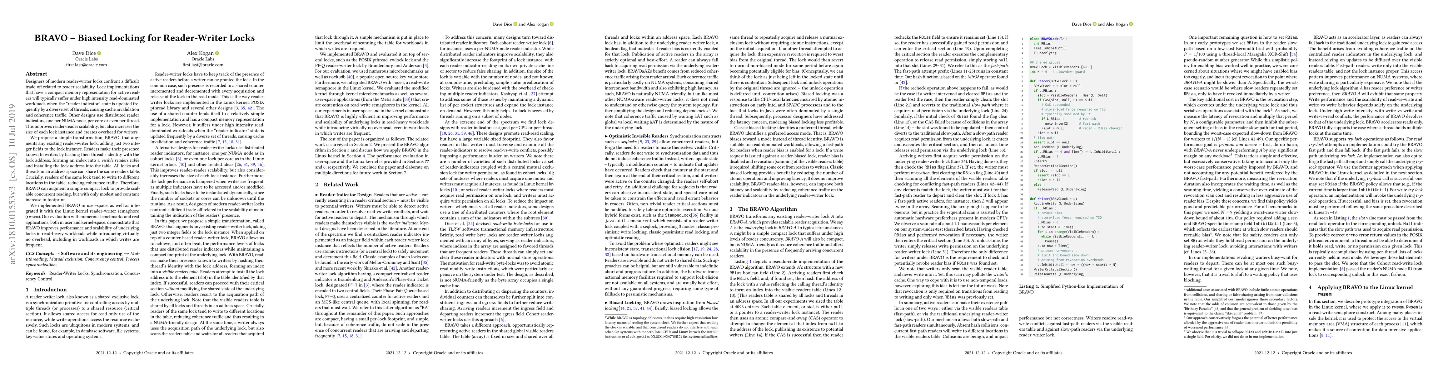 The paper proposes BRAVO, a simple transformation to augment existing reader-writer locks, adding minimal overhead to enhance reader scalability while reducing coherence traffic and maintaining a compact memory footprint. BRAVO uses a visible readers table to diffuse reader updates across different NUMA nodes, minimizing cache invalidation and coherence traffic.