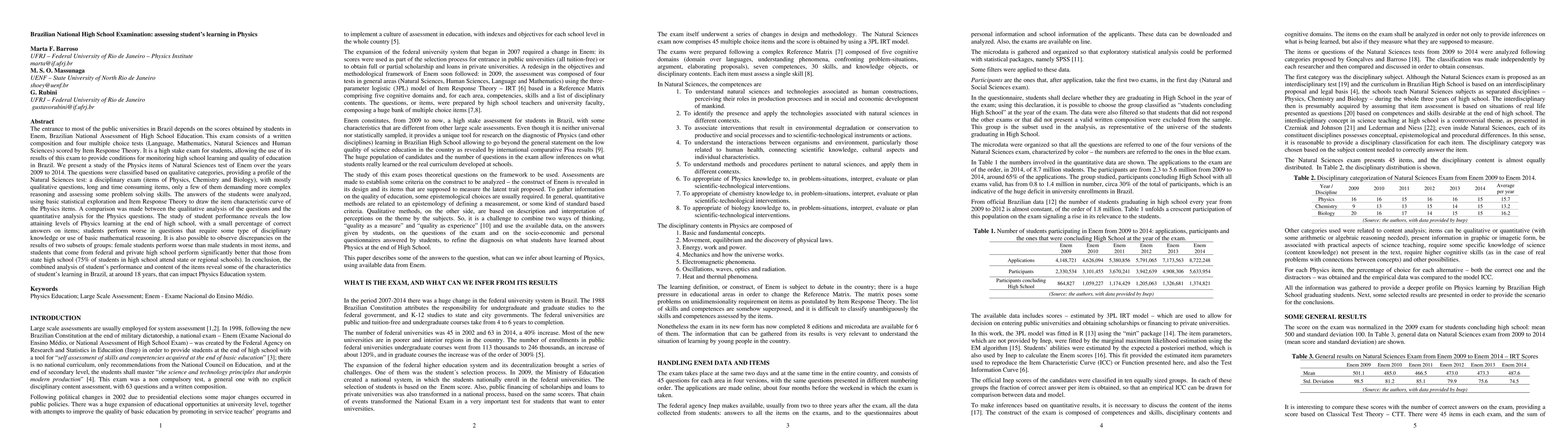 This study analyzes Physics items from Brazil's National High School Examination (Enem) from 2009 to 2014, revealing low student performance in Physics, with significant gender and school type disparities. The findings highlight the need for improvements in Physics education in Brazil.
