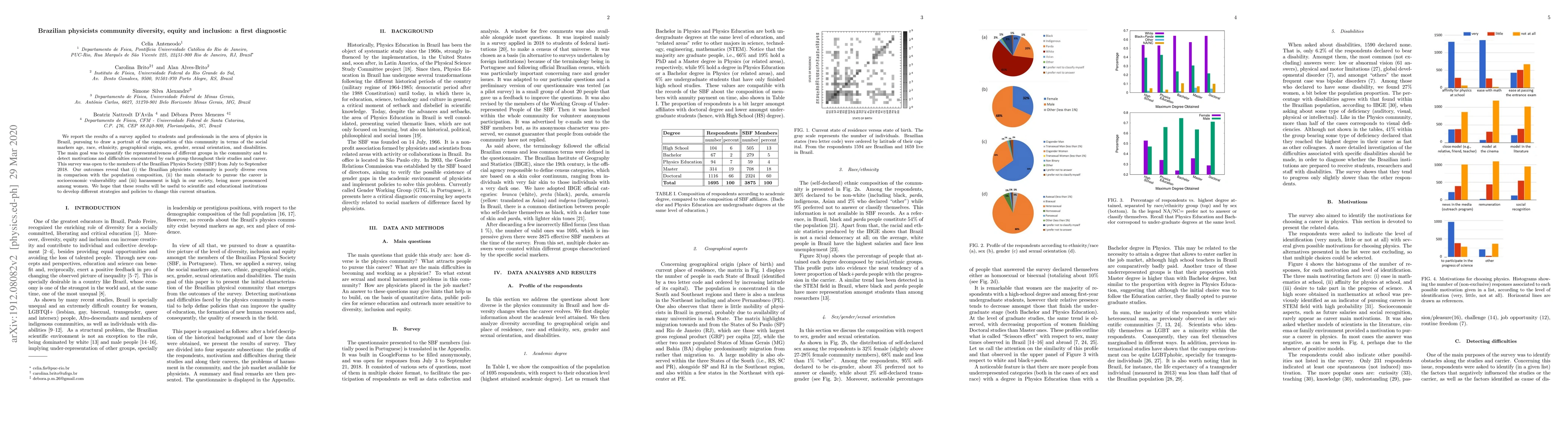 We report the results of a survey applied to students and professionals in the area of physics in Brazil, pursuing to draw a portrait of the composition of this community in terms of the social markers age, race, ethnicity, geographical origin, sex, gender, sexual orientation, and disabilities. The main goal was to quantify the representativeness of different groups in the community and to detect motivations and difficulties encountered by each group throughout their studies and career. This survey was open to the members of the Brazilian Physics Society (SBF) from July to September 2018. Our outcomes reveal that (i) the Brazilian physicists community is poorly diverse even in comparison with the population composition, (ii) the main obstacle to pursue the career is socioeconomic vulnerability and (iii) harassment is high in our society, being more pronounced among women. We hope that these results will be useful to scientific and educational institutions to develop different strategies and policies to change this current situation.