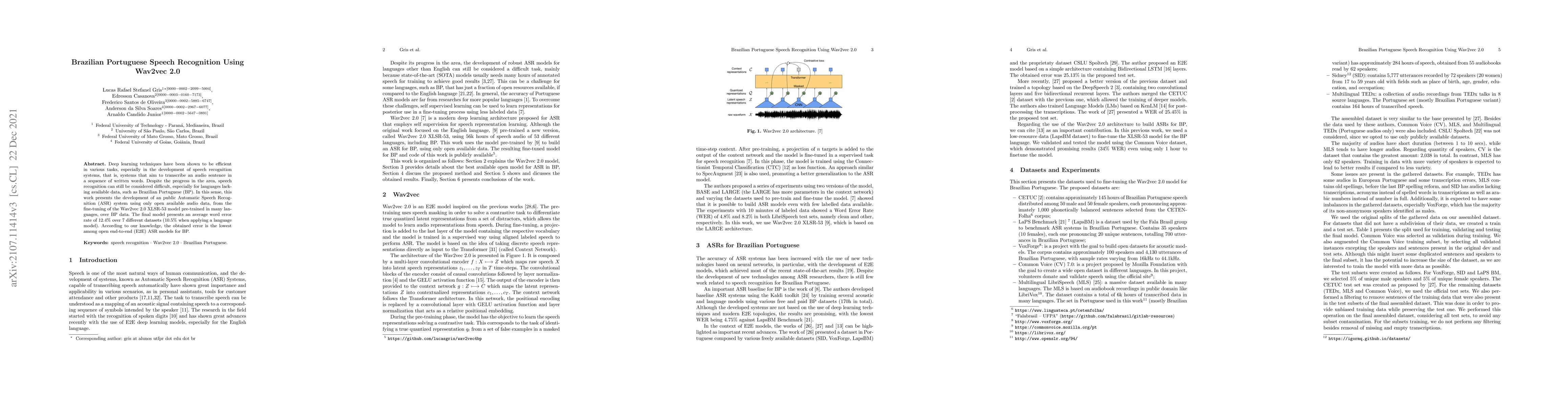 This paper develops an Automatic Speech Recognition (ASR) system for Brazilian Portuguese using the fine-tuned Wav2vec 2.0 model, achieving an average word error rate of 12.4%, which is the lowest reported for open-end-to-end ASR models for this language. The improvement to 10.5% is noted with the application of a language model.