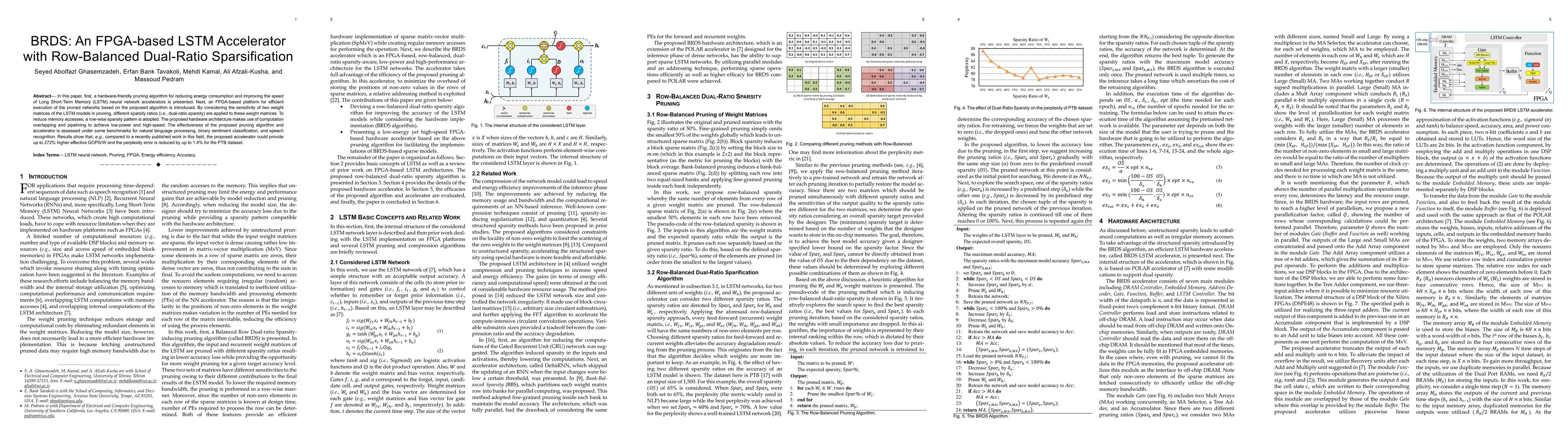 This paper presents a hardware-friendly pruning algorithm for LSTM neural networks to reduce energy consumption and improve speed, and introduces an FPGA-based accelerator utilizing dual-ratio sparsity and row-balanced sparse patterns. Benchmarks show significant improvements in performance and efficiency.