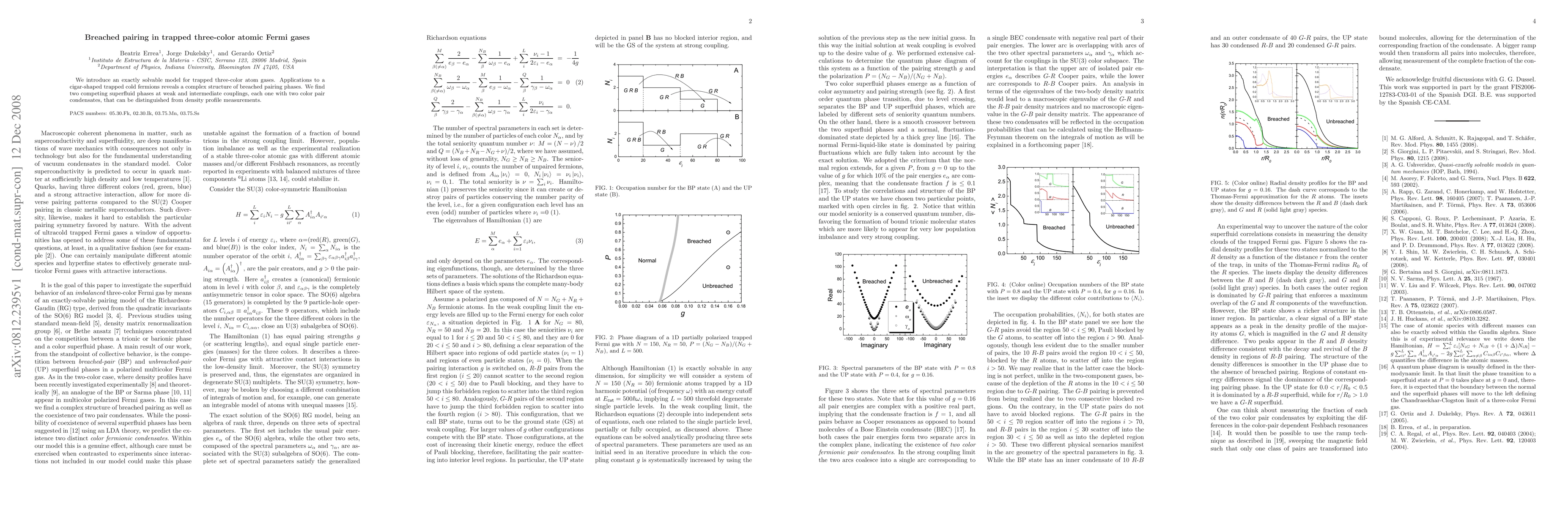 We introduce an exactly solvable model for trapped three-color atom gases. Applications to a cigar-shaped trapped cold fermions reveal a complex structure of breached pairing phases. We find two competing superfluid phases at weak and intermediate couplings, each one with two color pair condensates, that can be distinguished from density profile measurements.