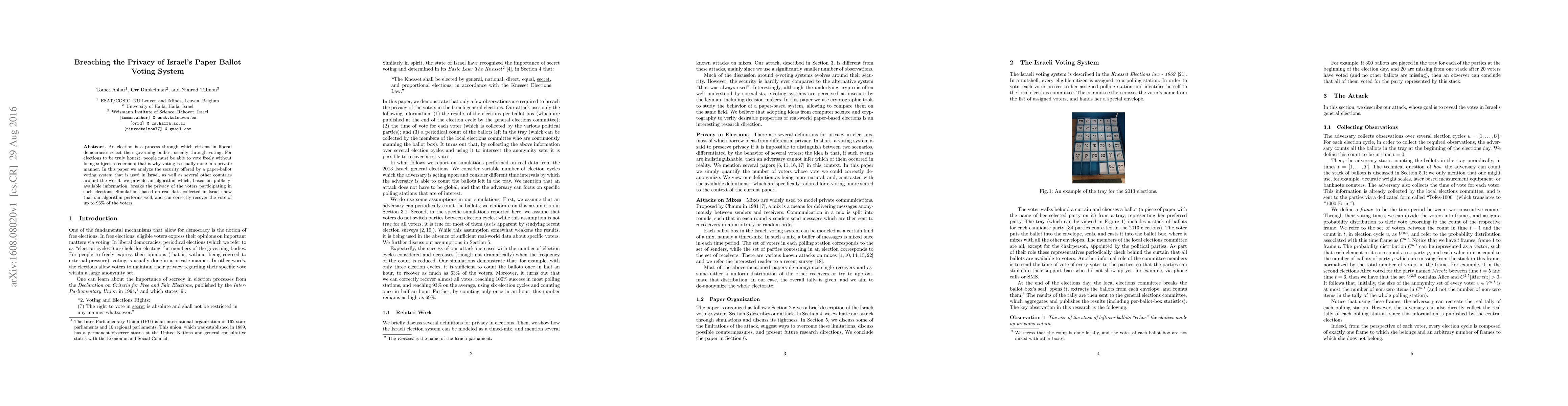 This paper analyzes the security of Israel's paper-ballot voting system, revealing an algorithm that breaches voter privacy using publicly available information. Simulations demonstrate the algorithm's effectiveness in correctly identifying the votes of up to 96% of participants.