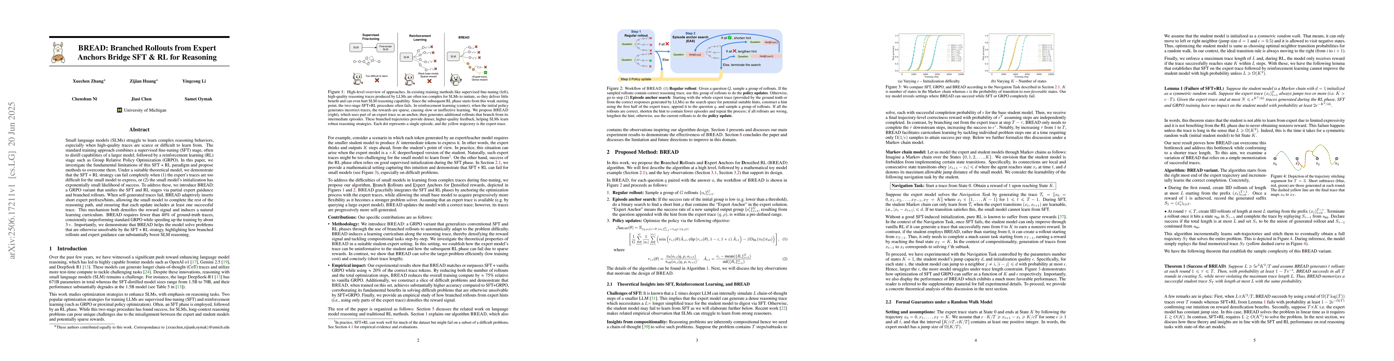 The paper introduces BREAD, a method to enhance reasoning in small language models. BREAD combines supervised fine-tuning and reinforcement learning, addressing their limitations by using expert guidance and branched rollouts. This approach requires fewer traces, speeds up training, and helps solve previously unsolvable problems, demonstrating significant improvement in small model reasoning capabilities.