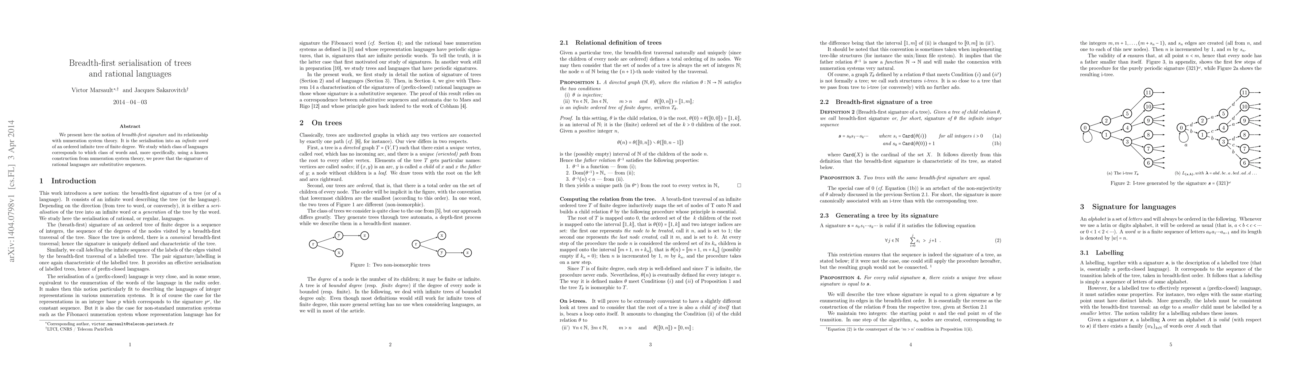 We present here the notion of breadth-first signature and its relationship with numeration system theory. It is the serialisation into an infinite word of an ordered infinite tree of finite degree. We study which class of languages corresponds to which class of words and,more specifically, using a known construction from numeration system theory, we prove that the signature of rational languages are substitutive sequences.