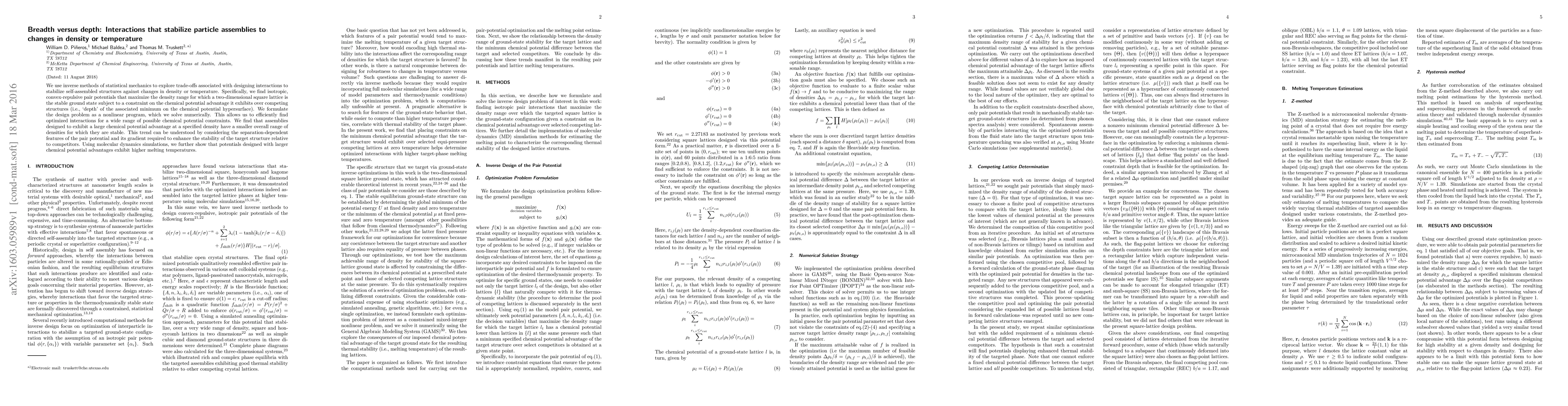 We use inverse methods of statistical mechanics to explore trade-offs associated with designing interactions to stabilize self-assembled structures against changes in density or temperature. Specifically, we find isotropic,convex-repulsive pair potentials that maximize the density range for which a two-dimensional square lattice is the stable ground state subject to a constraint on the chemical potential advantage it exhibits over competing structures (i.e., 'depth' of the associated minimum on the chemical potential hypersurface). We formulate the design problem as a non-linear program, which we solve numerically. This allows us to efficiently find optimized interactions for a wide range of possible chemical potential constraints. We find that assemblies designed to exhibit a large chemical potential advantage at a specified density have a smaller overall range of densities for which they are stable. This trend can be understood by considering the separation-dependent features of the pair potential and its gradient required to enhance the stability of the target structure relative to competitors. Using molecular dynamics simulations, we further show that potentials designed with larger chemical potential advantages exhibit higher melting temperatures.