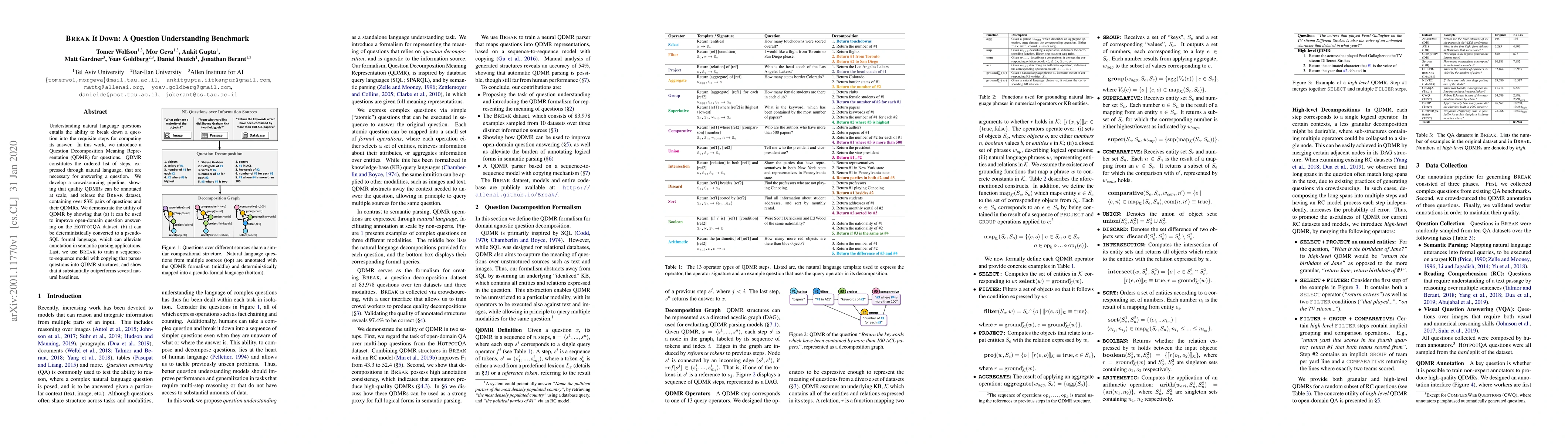 Understanding natural language questions entails the ability to break down a question into the requisite steps for computing its answer. In this work, we introduce a Question Decomposition Meaning Representation (QDMR) for questions. QDMR constitutes the ordered list of steps, expressed through natural language, that are necessary for answering a question. We develop a crowdsourcing pipeline, showing that quality QDMRs can be annotated at scale, and release the Break dataset, containing over 83K pairs of questions and their QDMRs. We demonstrate the utility of QDMR by showing that (a) it can be used to improve open-domain question answering on the HotpotQA dataset, (b) it can be deterministically converted to a pseudo-SQL formal language, which can alleviate annotation in semantic parsing applications. Last, we use Break to train a sequence-to-sequence model with copying that parses questions into QDMR structures, and show that it substantially outperforms several natural baselines.