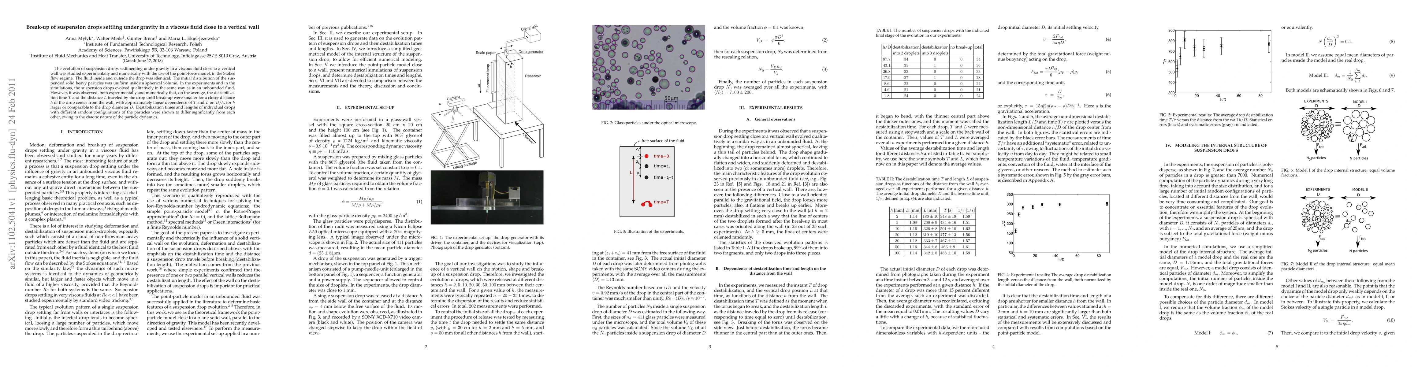 This paper investigates the sedimentation and break-up of suspension drops in a viscous fluid near a vertical wall, finding that closer proximity to the wall decreases destabilization time and travel distance, with linear dependence on the ratio of drop diameter to wall distance. Individual drops exhibit varied destabilization times due to the chaotic nature of particle dynamics.