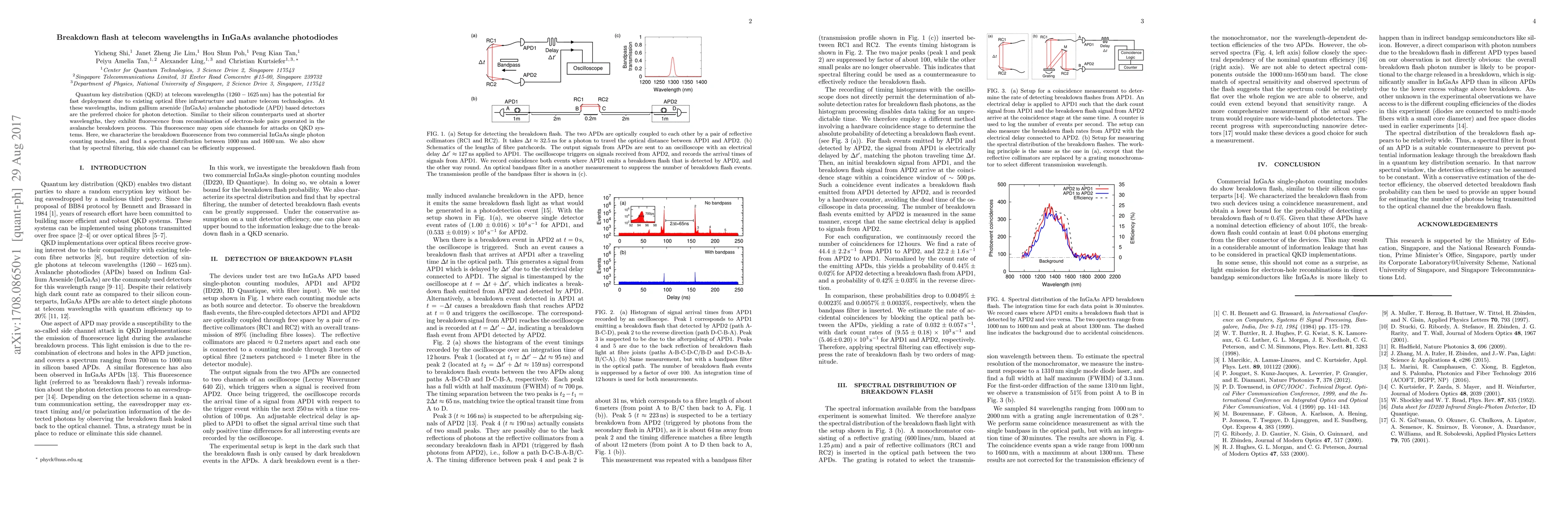 This paper investigates the breakdown fluorescence in InGaAs avalanche photodiodes used for telecom wavelength quantum key distribution, identifying a spectral distribution between 1000nm and 1600nm. The study demonstrates that spectral filtering can effectively suppress this potential side channel for attacks on QKD systems.