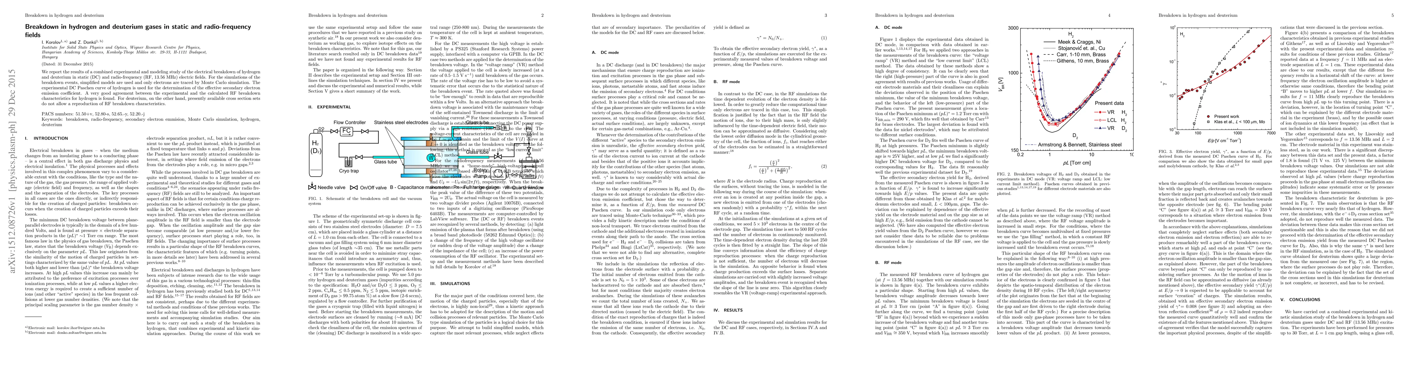 We report the results of a combined experimental and modeling study of the electrical breakdown of hydrogen and deuterium in static (DC) and radio-frequency (RF, 13.56 MHz) electric fields. For the simulations of the breakdown events, simplified models are used and only electrons are traced by Monte Carlo simulation. The experimental DC Paschen curve of hydrogen is used for the determination of the effective secondary electron emission coefficient. A very good agreement between the experimental and the calculated RF breakdown characteristics for hydrogen is found. For deuterium, on the other hand, presently available cross section sets do not allow a reproduction of RF breakdown characteristics.