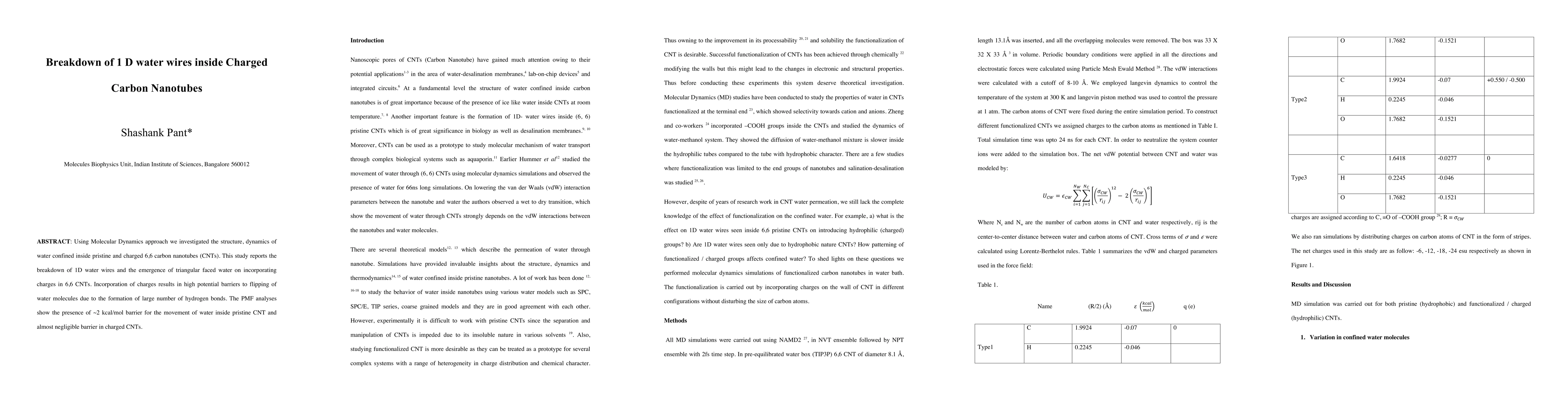 Using Molecular Dynamics approach we investigated the structure, dynamics of water confined inside pristine and charged 6,6 carbon nanotubes (CNTs). This study reports the breakdown of 1D water wires and the emergence of triangular faced water on incorporating charges in 6,6 CNTs. Incorporation of charges results in high potential barriers to the flipping of water molecules due to the formation of a large number of hydrogen bonds. The PMF analyses show the presence of ~2 kcal/mol barrier for the movement of water inside pristine CNT and almost negligible barrier in charged CNTs.