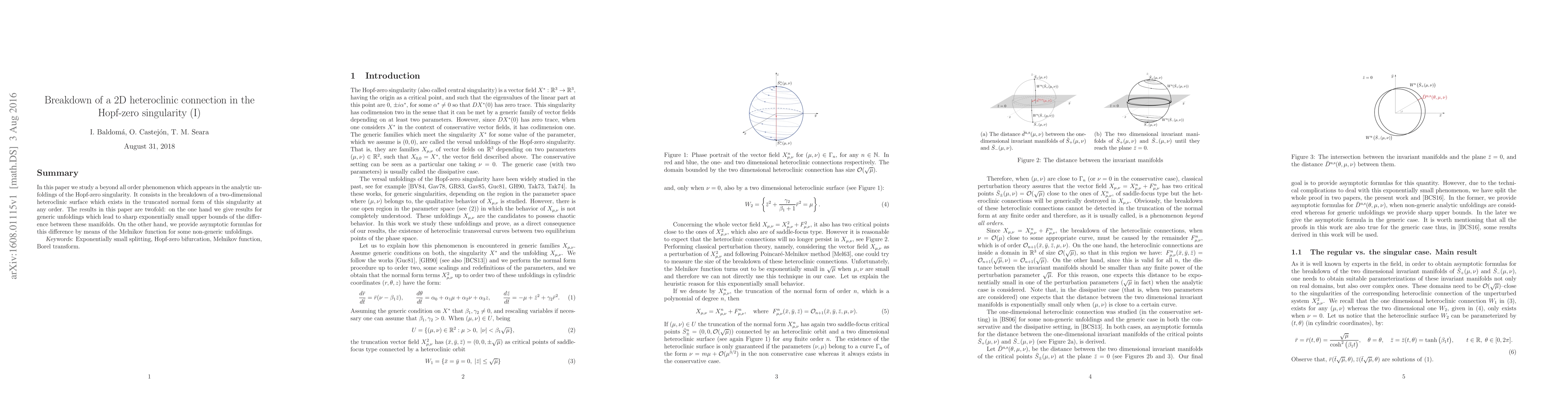 In this paper we study a beyond all order phenomenon which appears in the analytic unfoldings of the Hopf-zero singularity. It consists in the breakdown of a two-dimensional heteroclinic surface which exists in the truncated normal form of this singularity at any order. The results in this paper are twofold: on the one hand we give results for generic unfoldings which lead to sharp exponentially small upper bounds of the difference between these manifolds. On the other hand, we provide asymptotic formulas for this difference by means of the Melnikov function for some non-generic unfoldings.