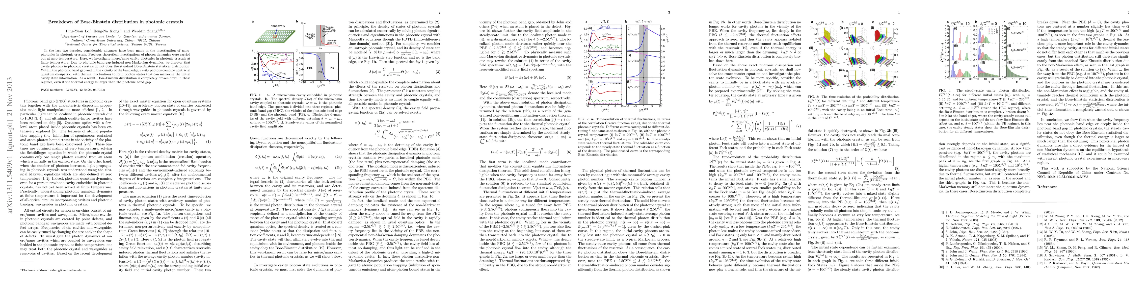 This paper investigates photonic dynamics in photonic crystals at finite temperature, revealing that cavity photons do not follow the standard Bose-Einstein distribution due to non-Markovian dynamics within the photonic band gap. The study finds that quantum dissipation and thermal fluctuations lead to a breakdown of the Bose-Einstein distribution in these regions.