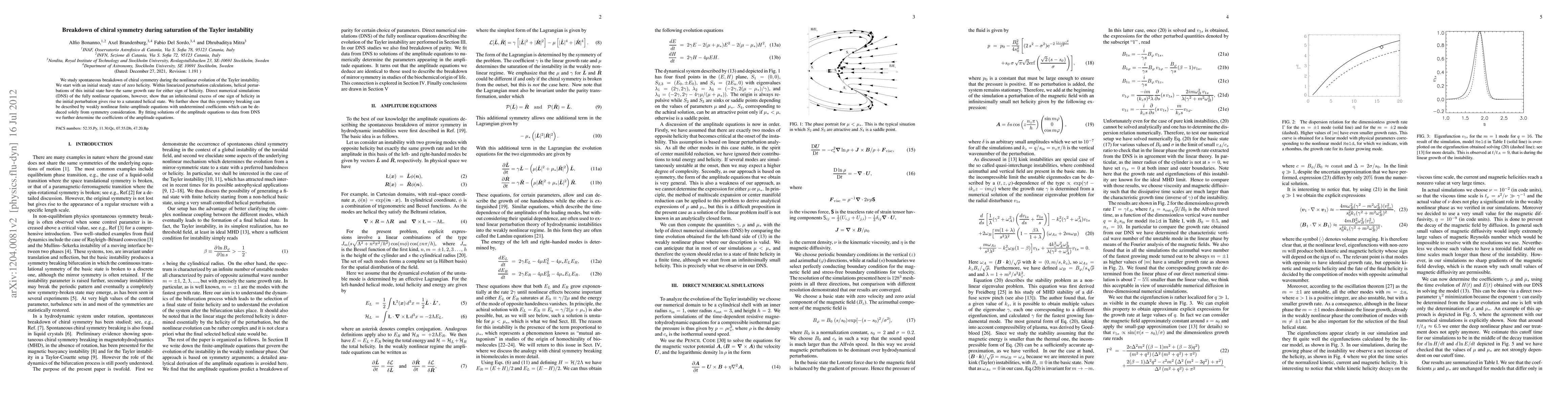 This paper investigates the spontaneous breakdown of chiral symmetry during the saturation of the Tayler instability, revealing that an initial infinitesimal excess of one helicity sign leads to a distinct saturated helical state. The study combines direct numerical simulations and weakly nonlinear finite-amplitude equations to determine the underlying symmetry-breaking mechanisms and coefficients.