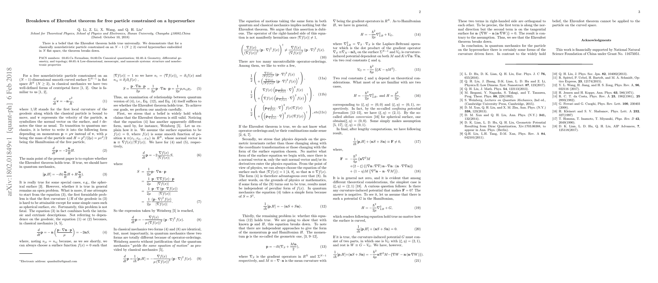 There is a belief that the Ehrenfest theorem holds true universally. We demonstrate that for a classically nonrelativistic particle constrained on an $N-1$ ($N\geq 2$) curved hypersurface embedded in $N$ flat space, the theorem breaks down.