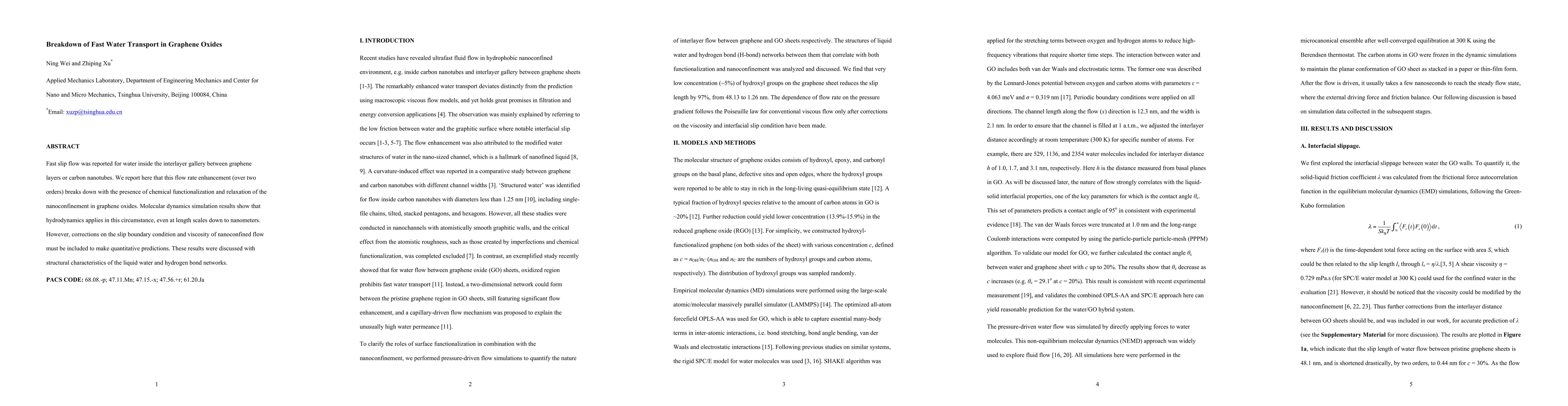 This research reveals the breakdown of fast slip flow in chemically functionalized graphene sheets and its dependence on hydroxyl groups and interlayer distance.
