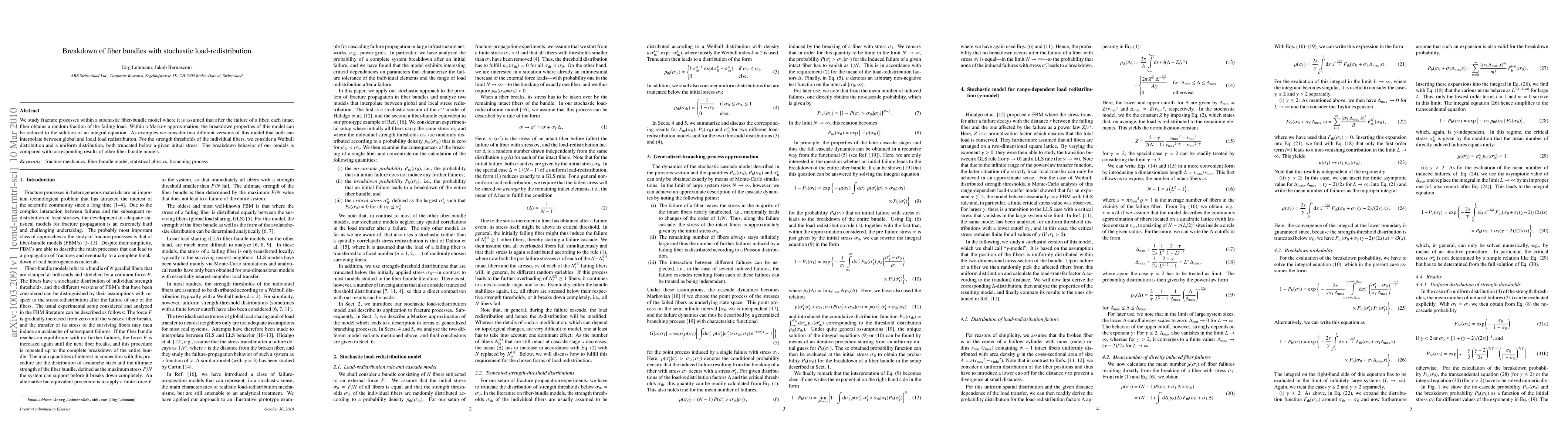 This paper investigates fracture processes in a stochastic fiber-bundle model where intact fibers redistribute a random fraction of the load after a fiber fails. The authors solve an integral equation to analyze the breakdown properties, considering both Weibull and uniform distributions for fiber strengths, and compare their results with other fiber-bundle models.