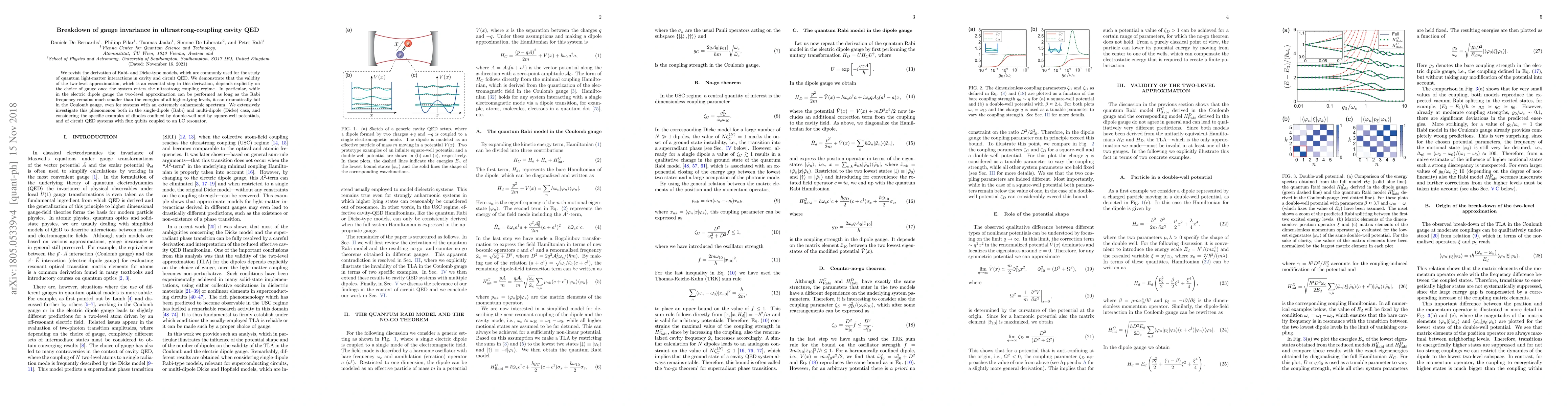 This paper examines the breakdown of gauge invariance in ultrastrong-coupling cavity QED, revealing that the two-level approximation in Rabi and Dicke models depends heavily on the chosen gauge, with significant failure in the Coulomb gauge compared to the electric dipole gauge. The study explores this issue in both single-dipole and multi-dipole systems.