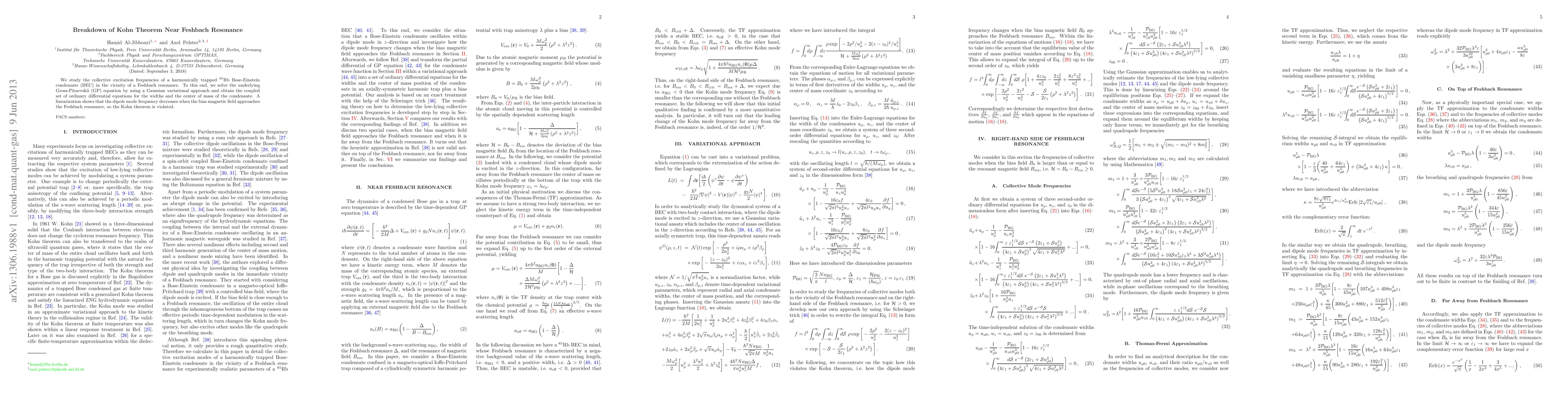 This paper investigates the collective excitation frequencies of a harmonically trapped 85Rb Bose-Einstein condensate near a Feshbach resonance, revealing that the dipole mode frequency decreases as the magnetic field approaches the resonance, thereby violating the Kohn theorem. The study employs a Gaussian variational approach to solve the Gross-Pitaevskii equation.