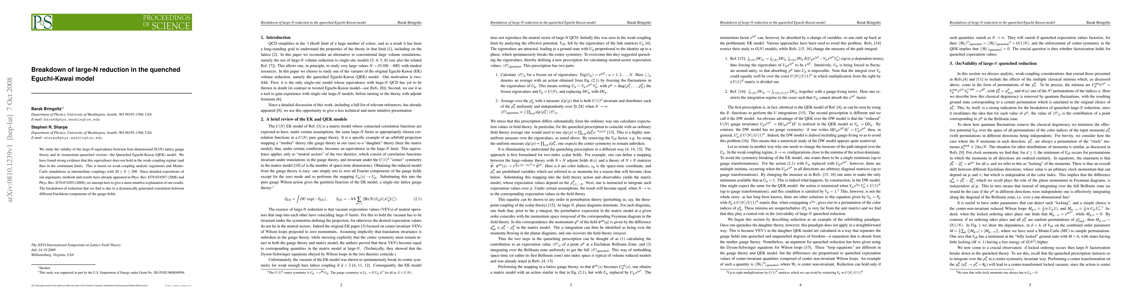 The paper presents detailed weak-coupling analytic arguments and Monte Carlo simulation results, demonstrating the breakdown of large-N reduction in the QEK model due to dynamically generated correlations between gauge field components.