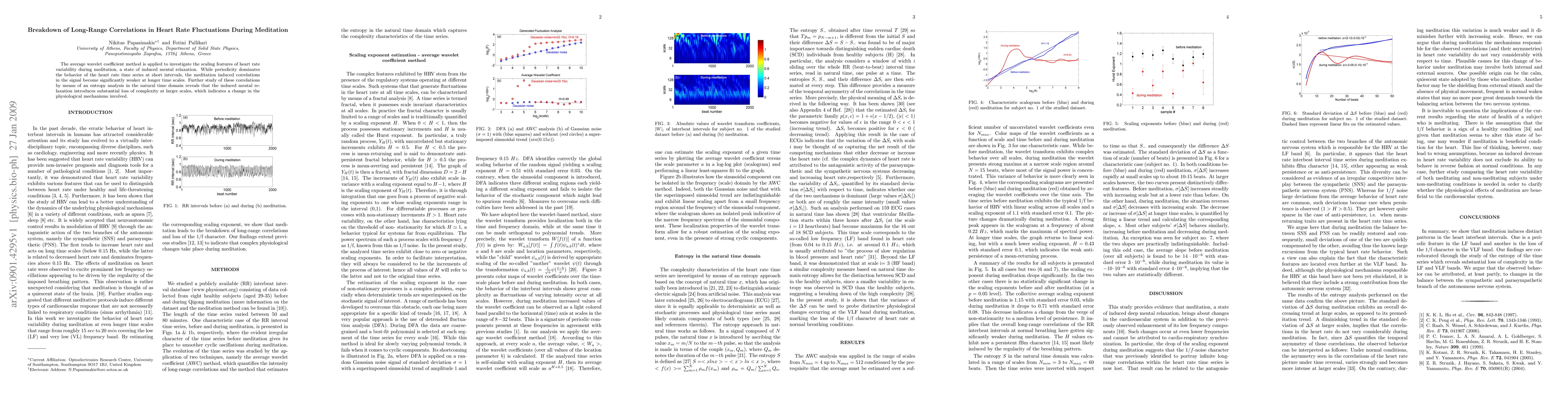 The average wavelet coefficient method is applied to investigate the scaling features of heart rate variability during meditation, a state of induced mental relaxation. While periodicity dominates the behavior of the heart rate time series at short intervals, the meditation induced correlations in the signal become significantly weaker at longer time scales. Further study of these correlations by means of an entropy analysis in the natural time domain reveals that the induced mental relaxation introduces substantial loss of complexity at larger scales, which indicates a change in the physiological mechanisms involved.